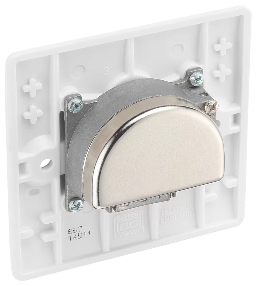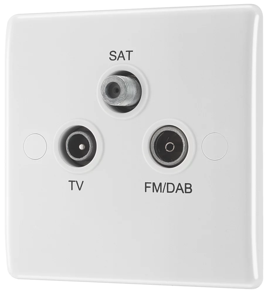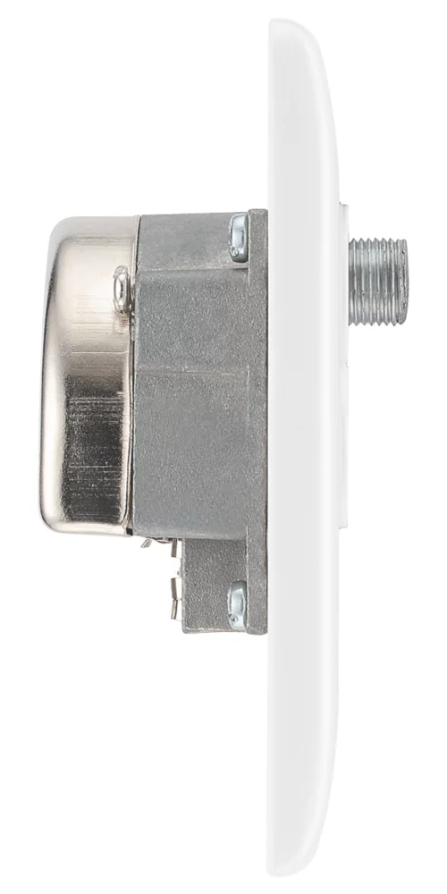 Provides outlets for TV, FM and satellite. Metal housing helps stop RF leakage and signal loss as well as protecting against impulse noise and EMI/RF interference. Moulded front-plate manufactured from thermoset urea, with inherent anti-microbial properties. Finished with softly rounded edges and screw caps.