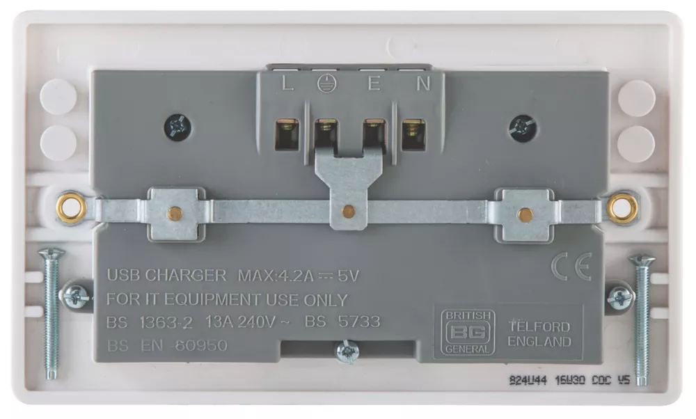White moulded socket with 4 USB charging ports. Ideal for mobile phones, tablets and other USB devices. Features protective overload function.