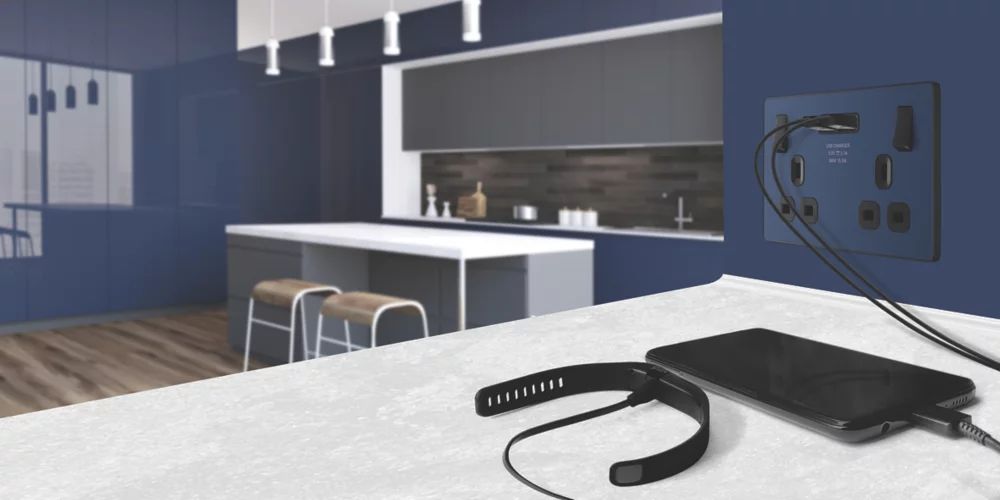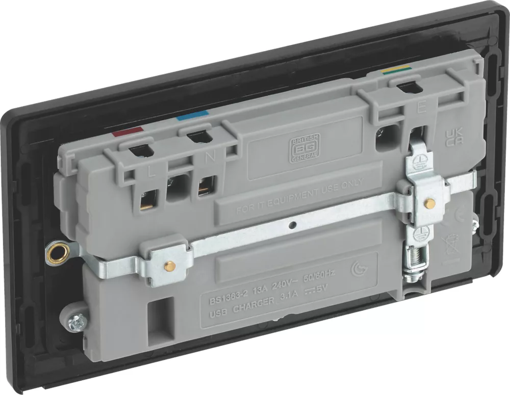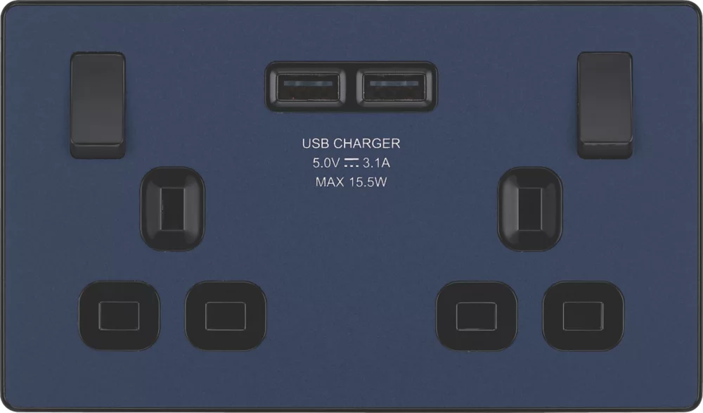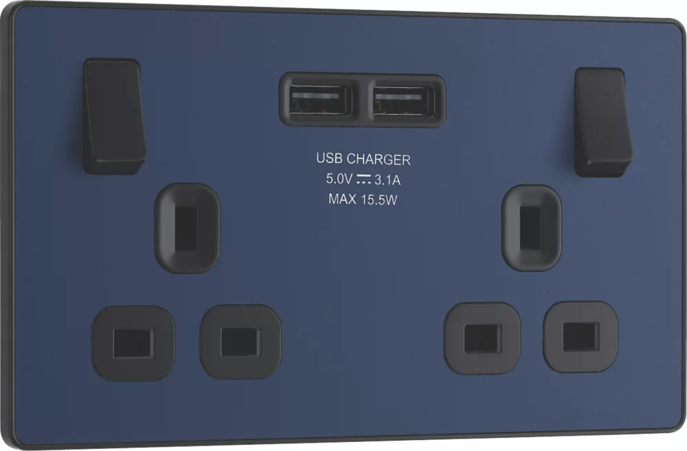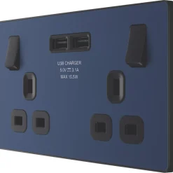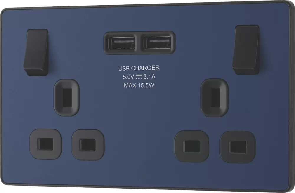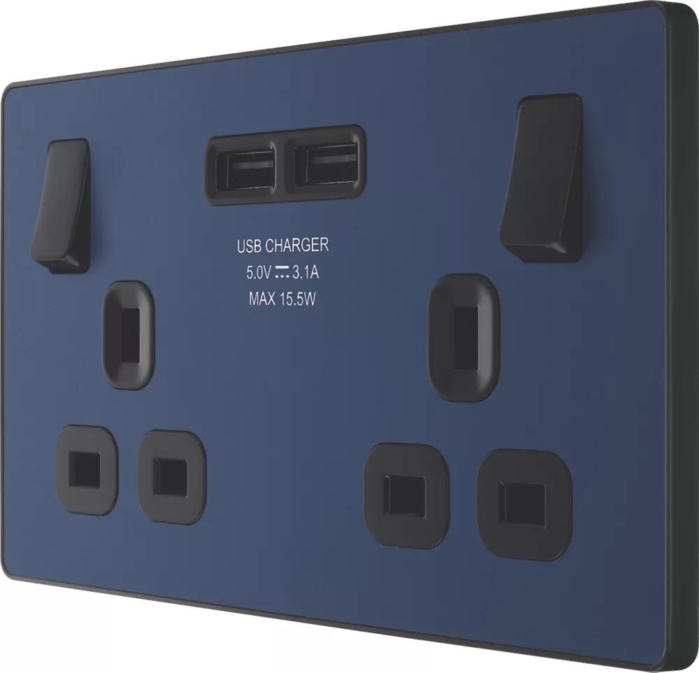 British General Evolve 13A 2-Gang SP Switched Socket + 3.1A 2-Outlet Type A USB Charger Blue With Black Inserts