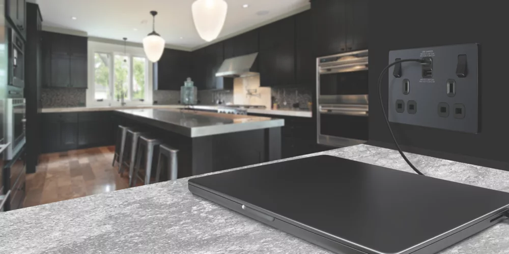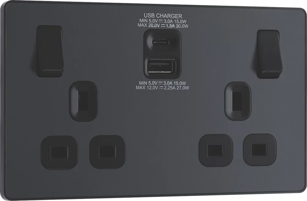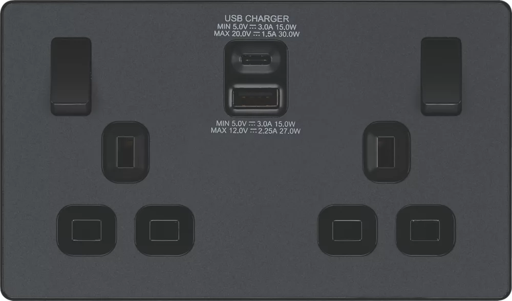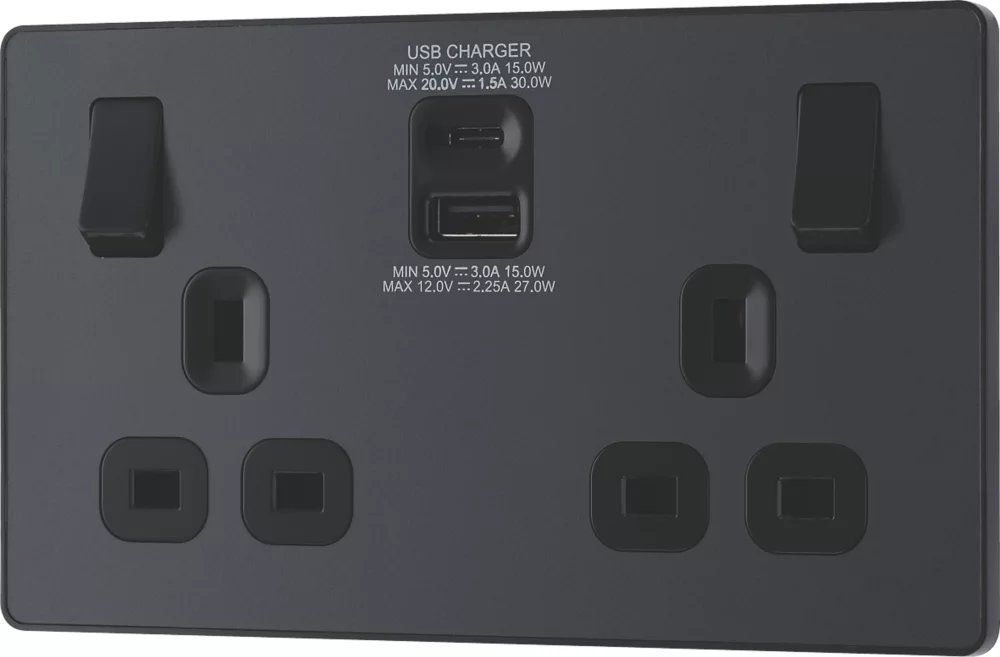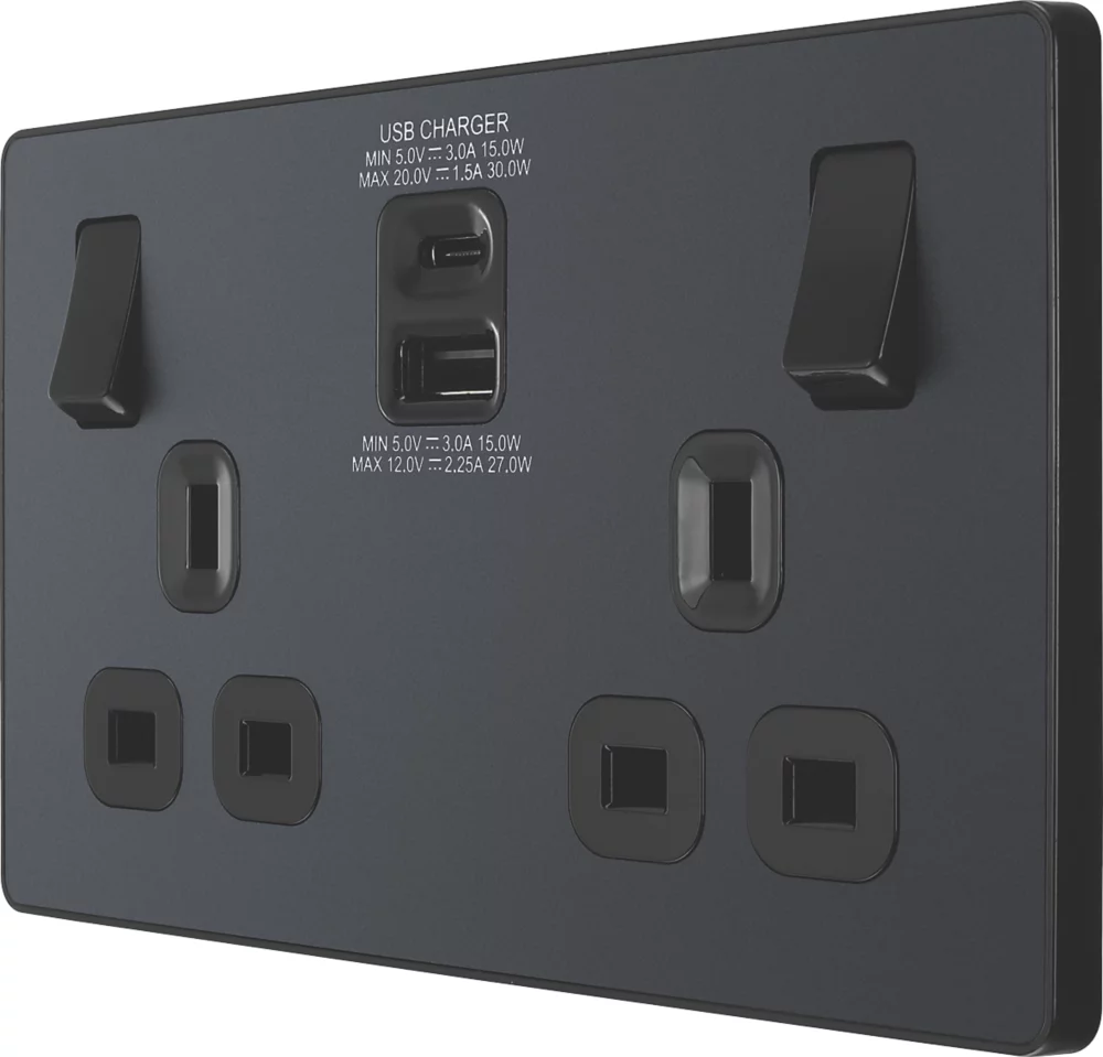 British General Evolve 13A 2-Gang SP Switched Socket + 3A 2-Outlet Type A & C USB Charger Grey With Black Inserts