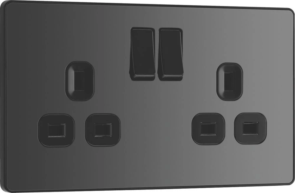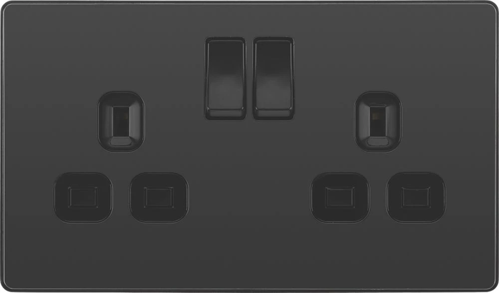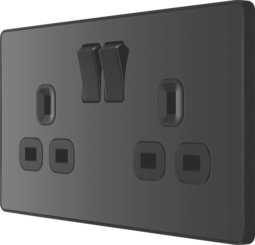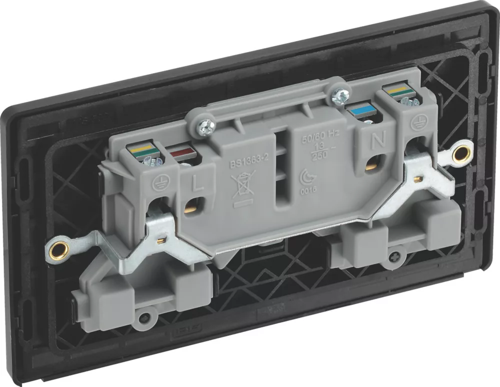 Double switched socket with colour-coded terminals and backed out captive screws for ease of installation. Fits 35mm back box, making it suitable for retro-fit replacement of existing sockets. Features low profile, screwless flat plate that clips on and off, ideal for modern interiors.
