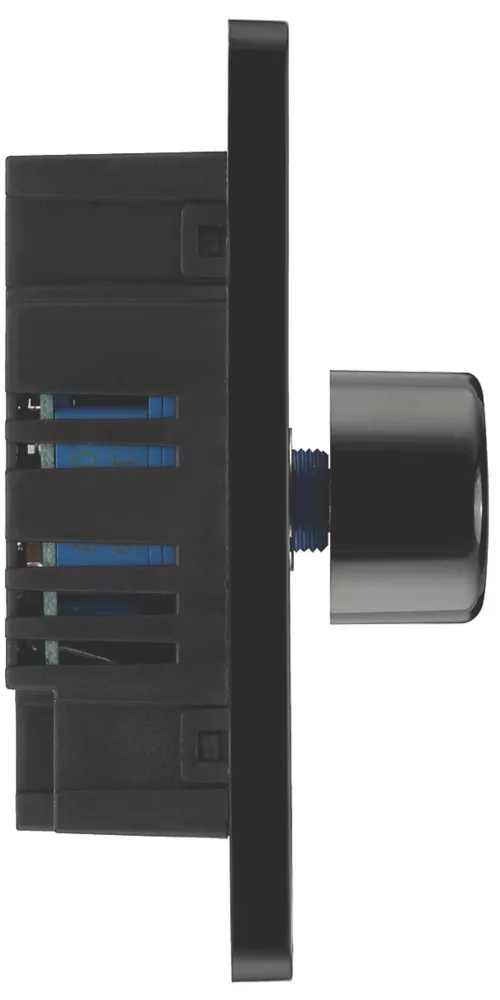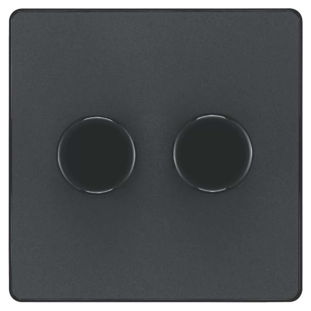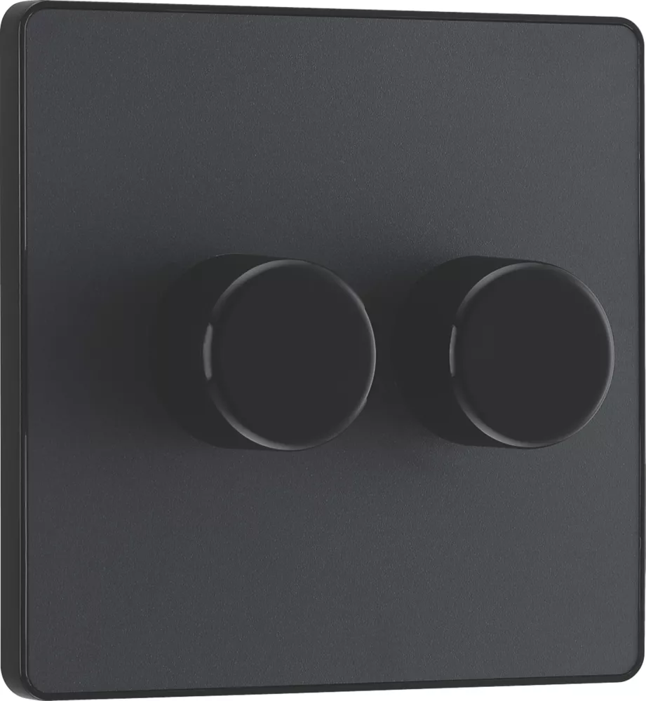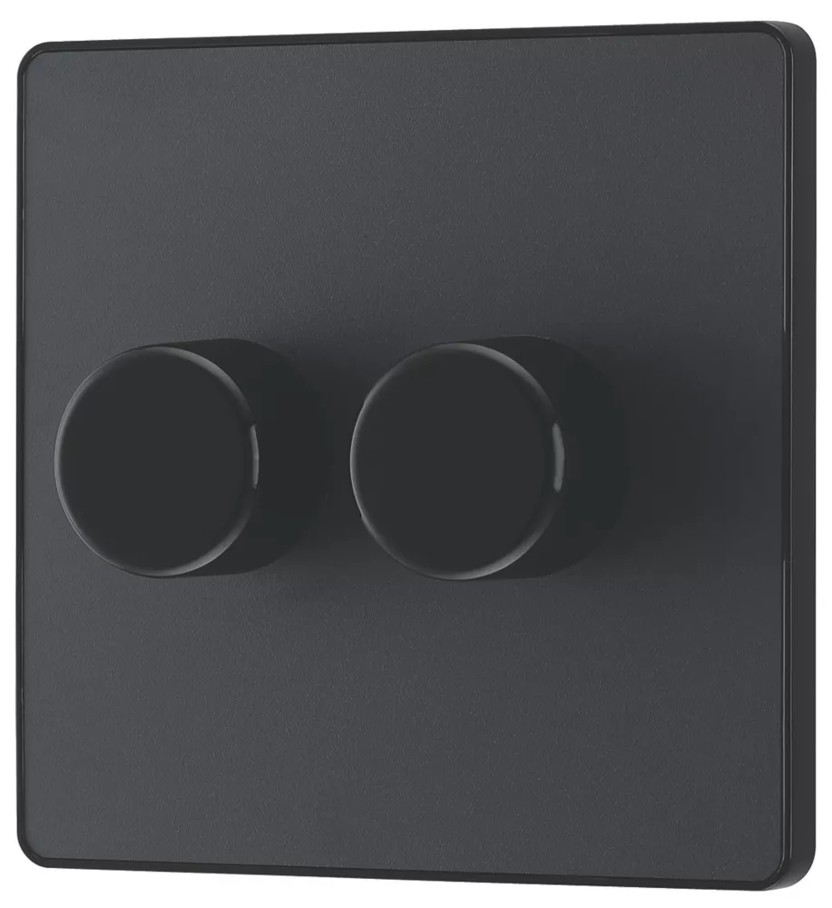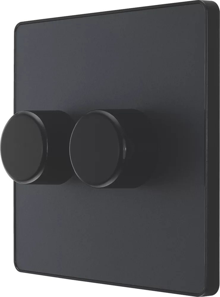 Evolve, trailing edge, double dimmer switch that controls light levels and sets mood. Intelligent electronic circuit monitors connected load and provides a soft-start with protection against thermal, current and voltage overload. Suitable for dimming LED, dimmable CFLs and traditional lighting. Soft-start brings the lights to a set level in around 1 second and extends lamp life. Silent operation means no noise when dimming, while support for low wattage lamps eliminates flicker. Low profile screwless flat plate that clips on and off. Ideal for modern interiors.