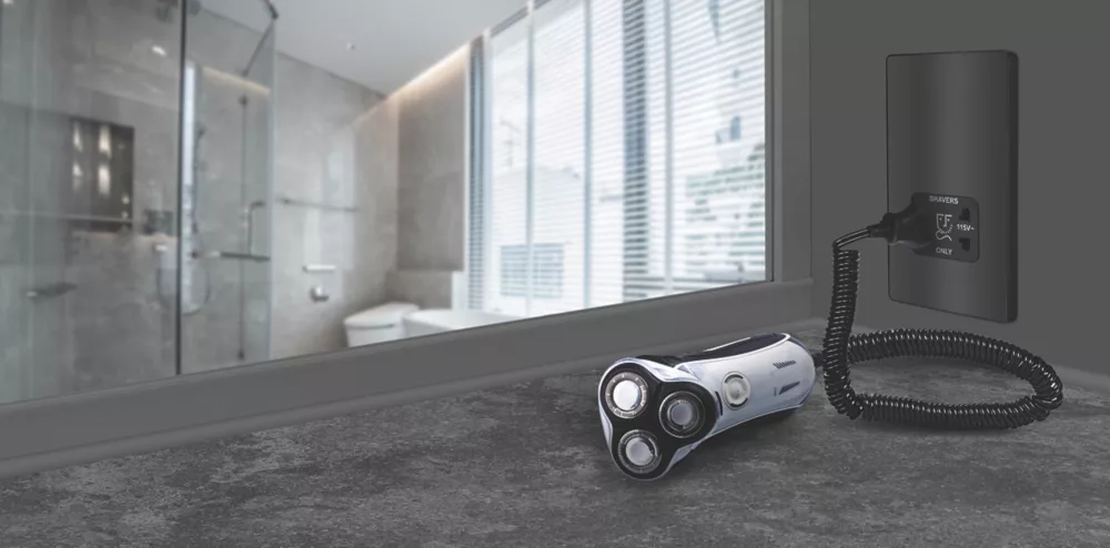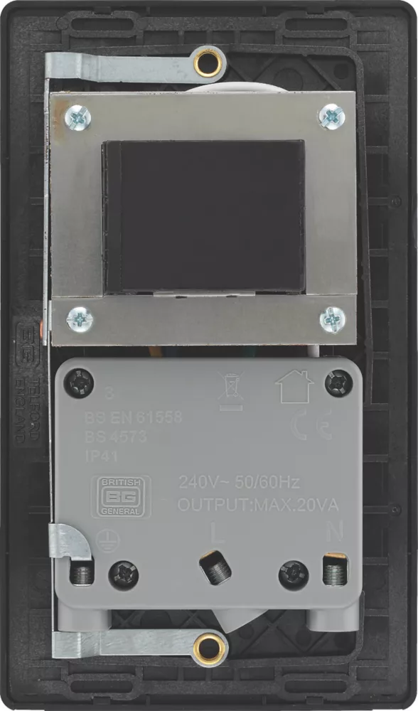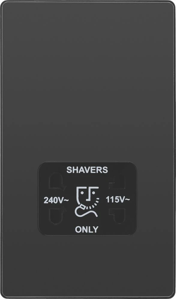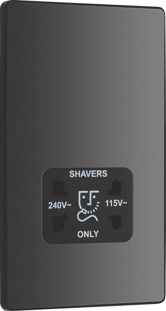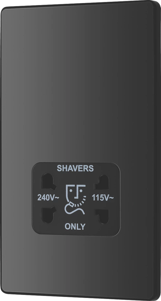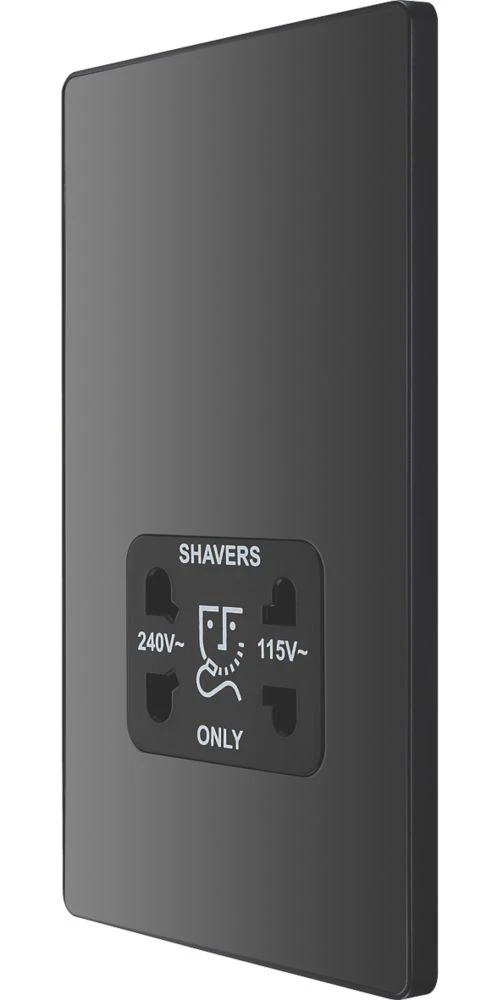 Black chrome, dual voltage shaver socket, suitable for use with both 240V and 115V shavers and electric toothbrushes. Low profile screwless flat plate clips on and off, making it ideal for modern interiors. Easy to install, with captive, backed out terminal screws to prevent screw loss.