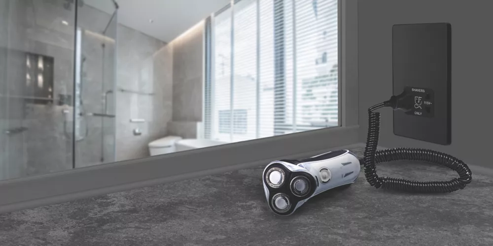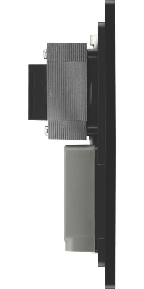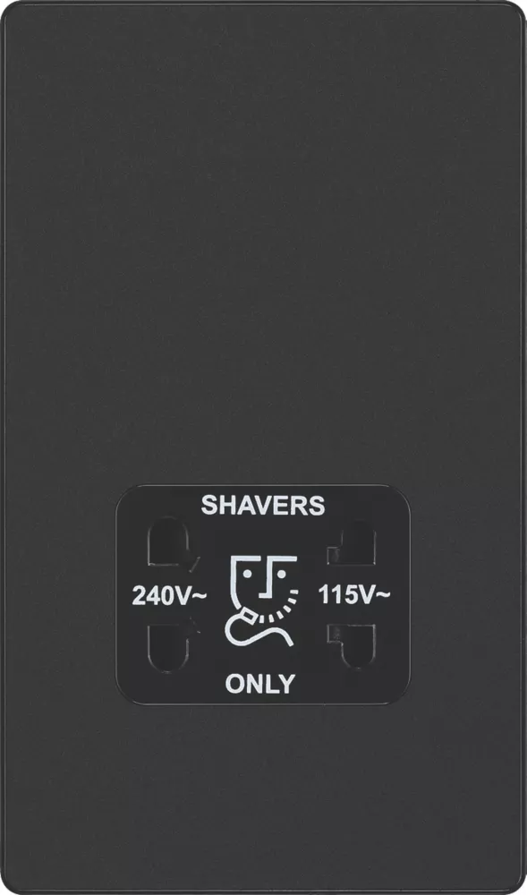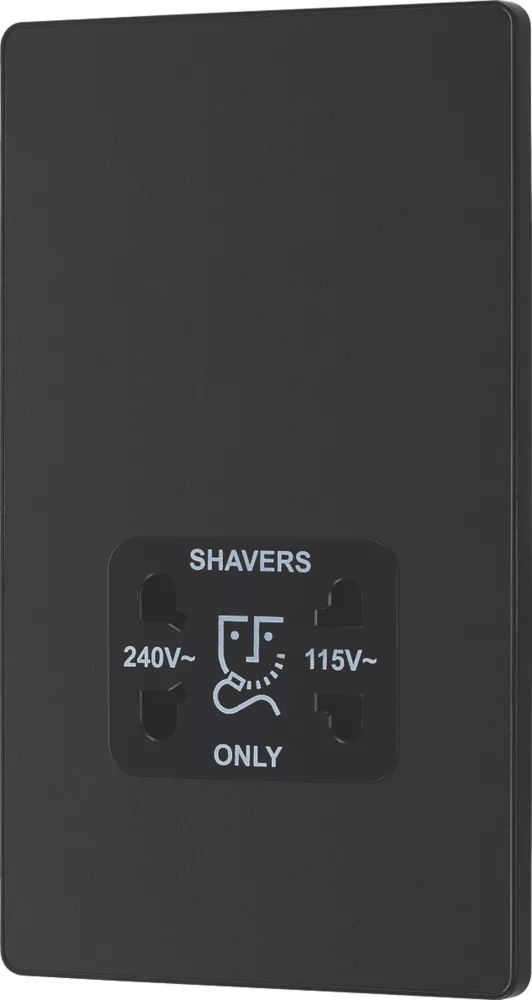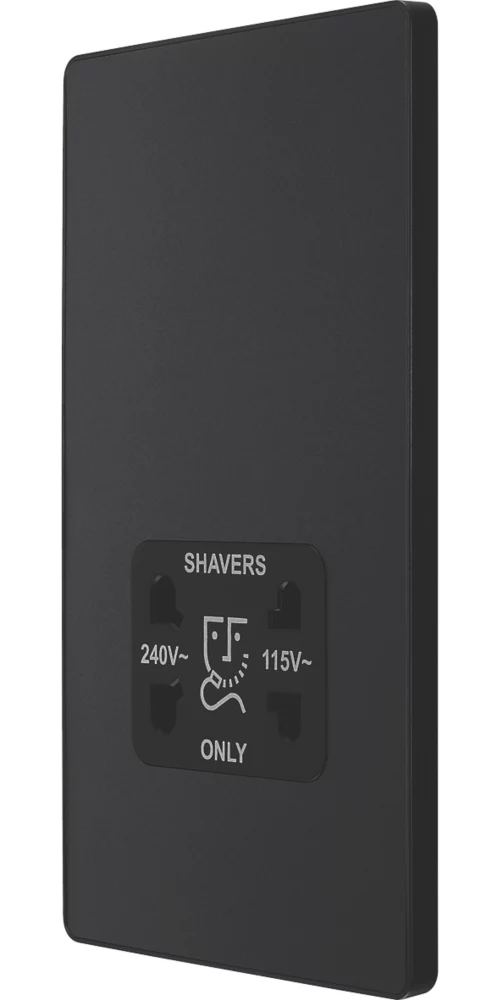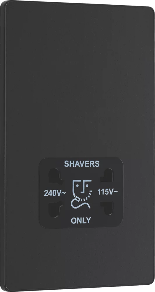 Matt black, dual voltage shaver socket, suitable for use with both 240V and 115V shavers and electric toothbrushes. Low profile screwless flat plate clips on and off, making it ideal for modern interiors. Easy to install, with captive, backed out terminal screws to prevent screw loss.