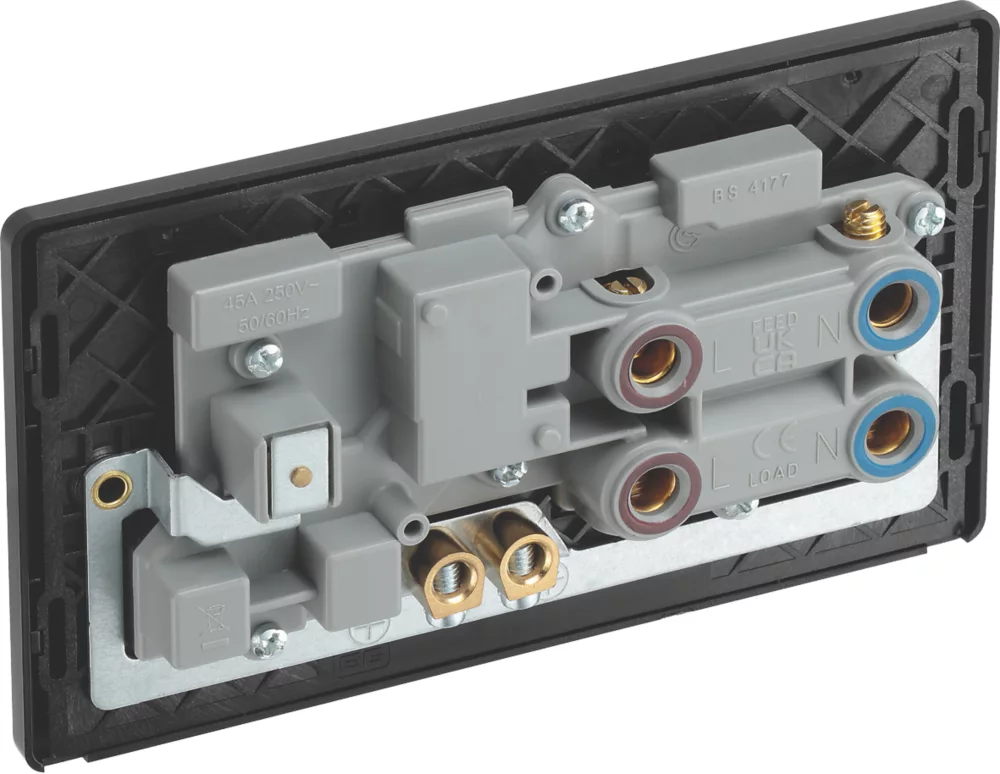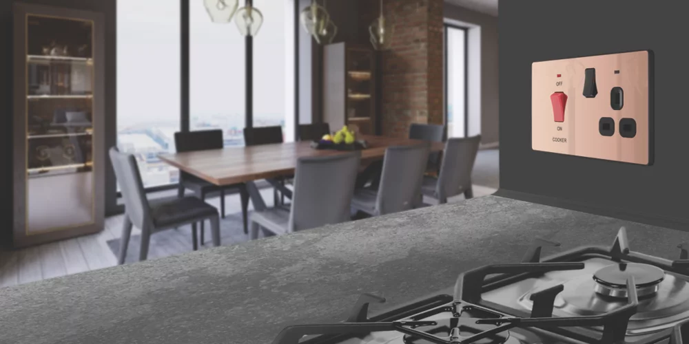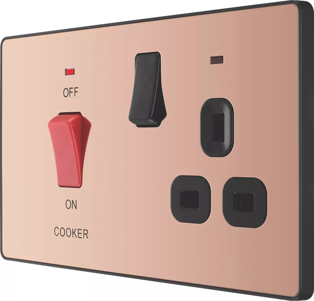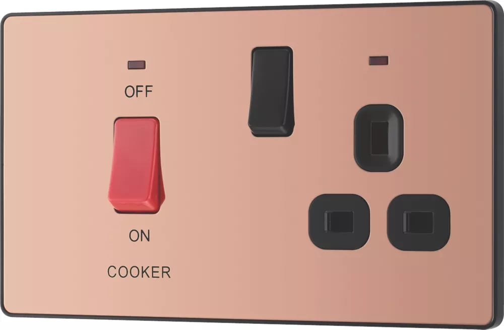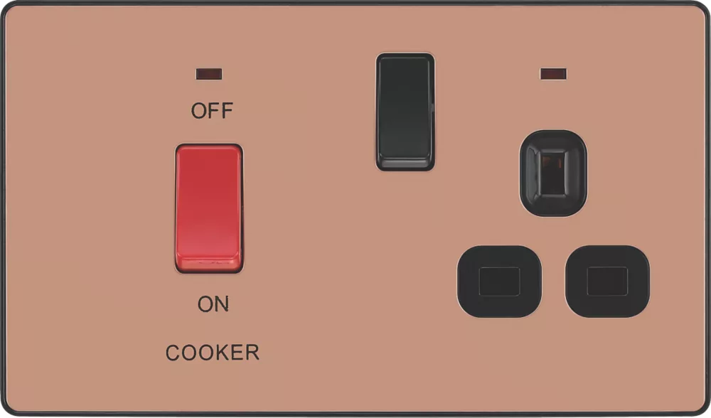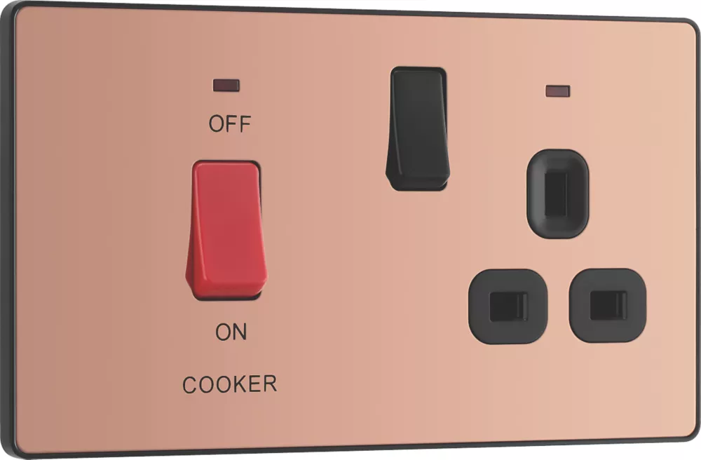 Cooker control unit with 13A socket for additional appliance outlet. Features flush LED indicators above socket and switch and low profile, screwless flat plate that clips on and off, making it ideal for modern interiors.