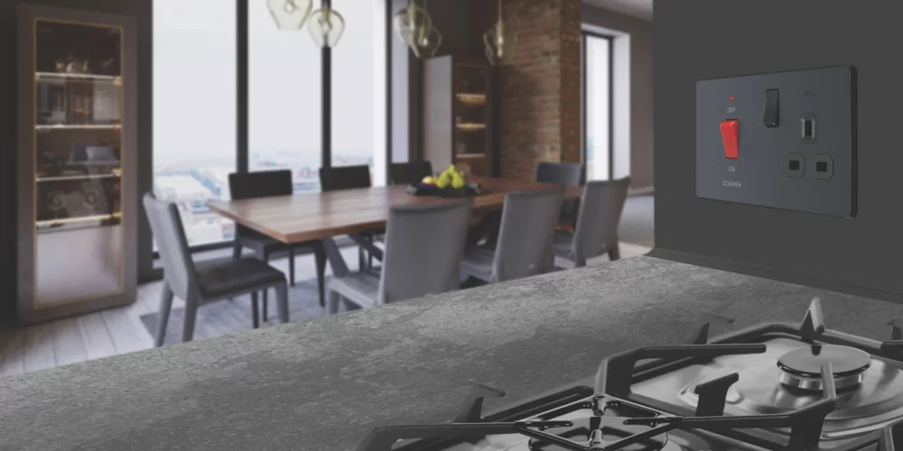 Cooker control unit with 13A socket for additional appliance outlet. Features flush LED indicators above socket and switch and low profile, screwless flat plate that clips on and off, making it ideal for modern interiors.