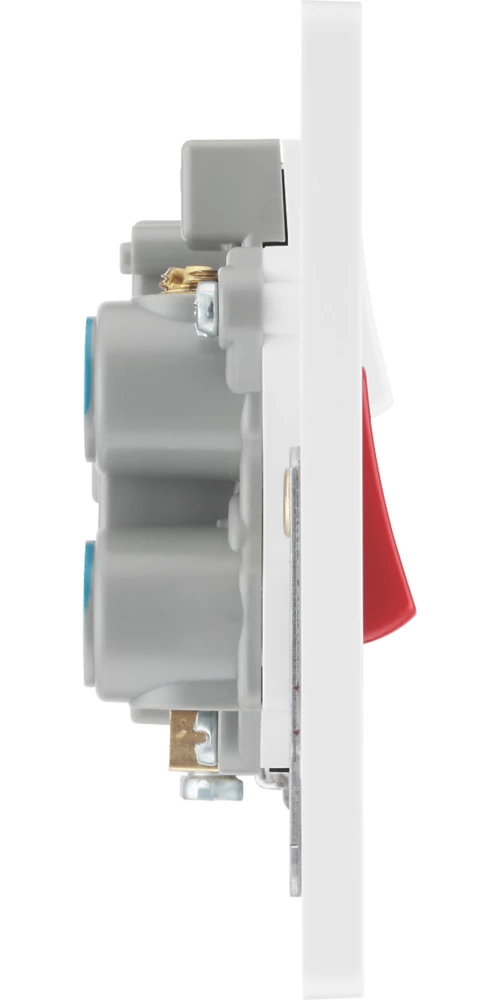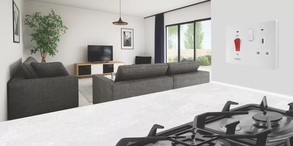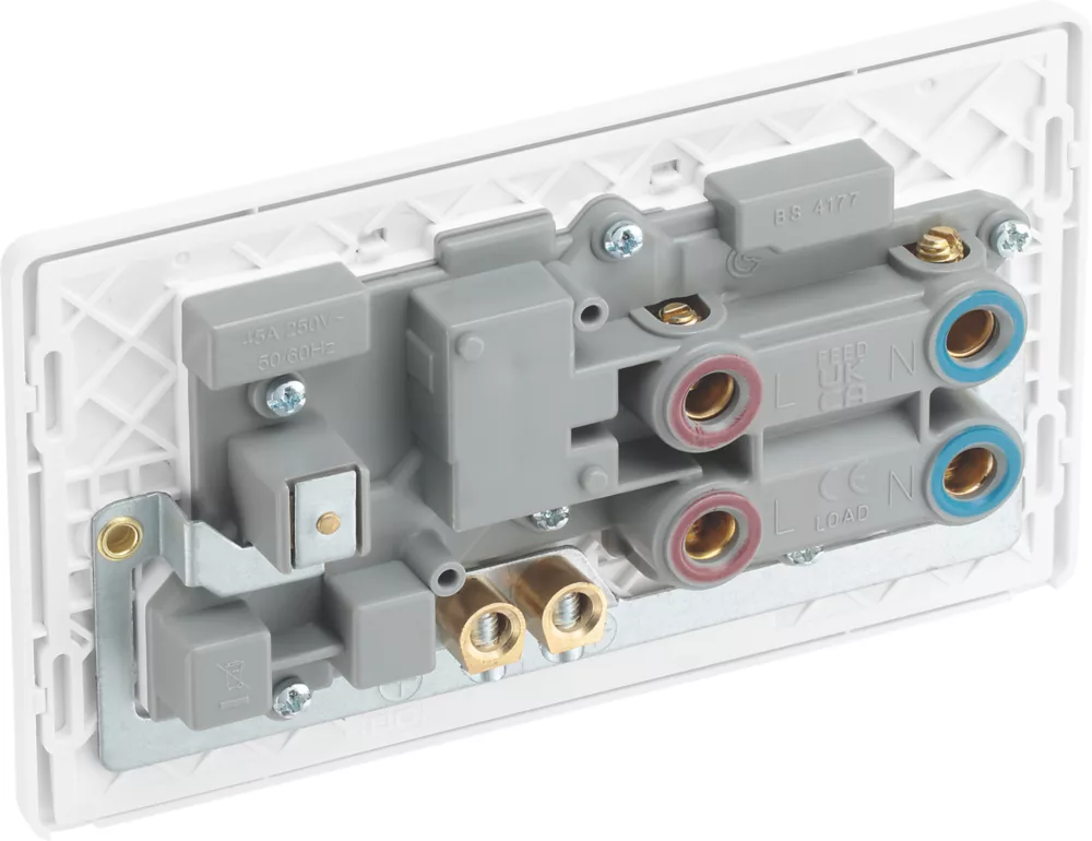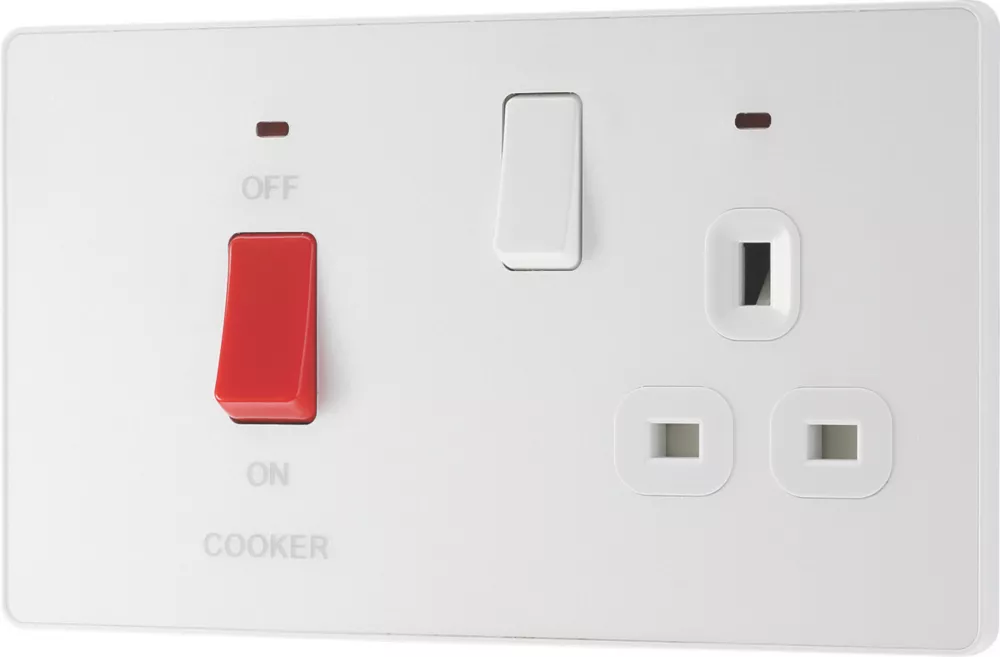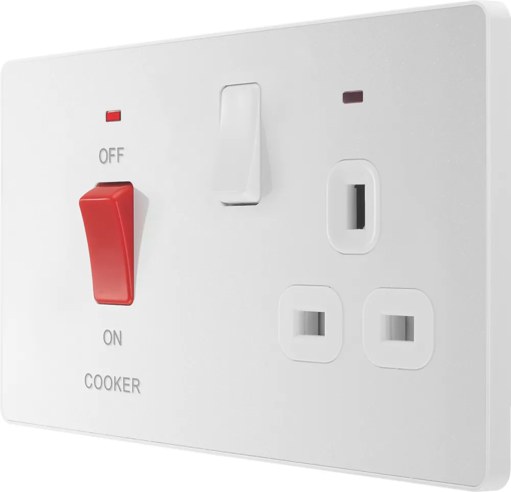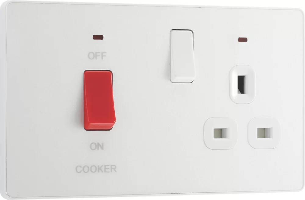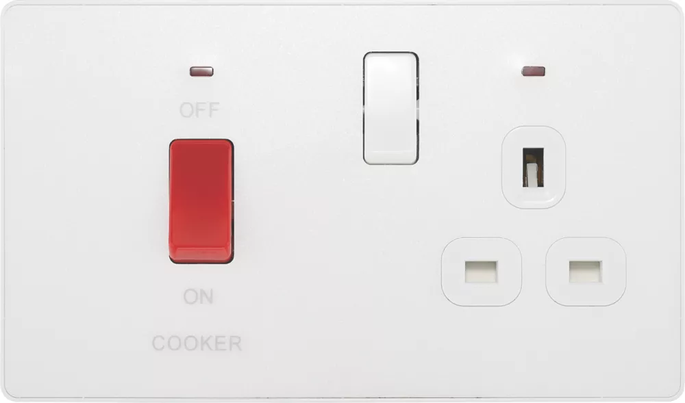 Cooker control unit with 13A socket for additional appliance outlet. Features flush LED indicators above socket and switch and low profile, screwless flat plate that clips on and off, making it ideal for modern interiors.