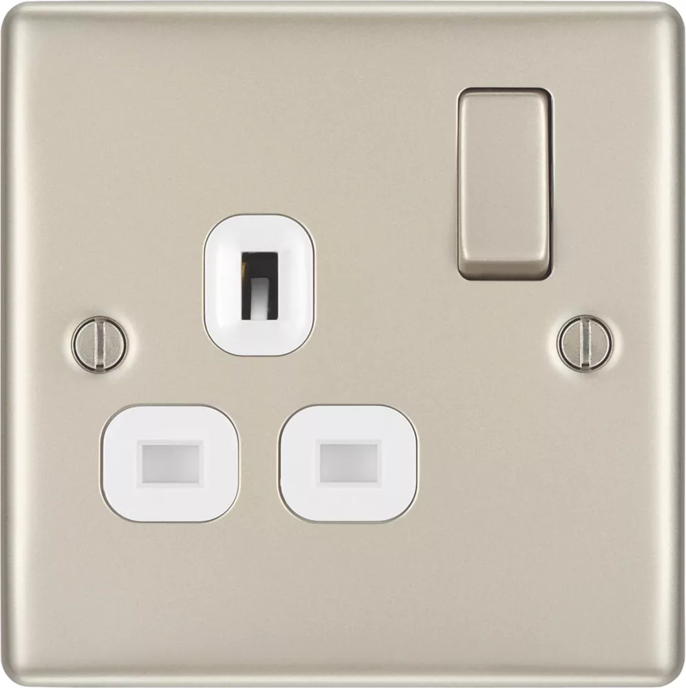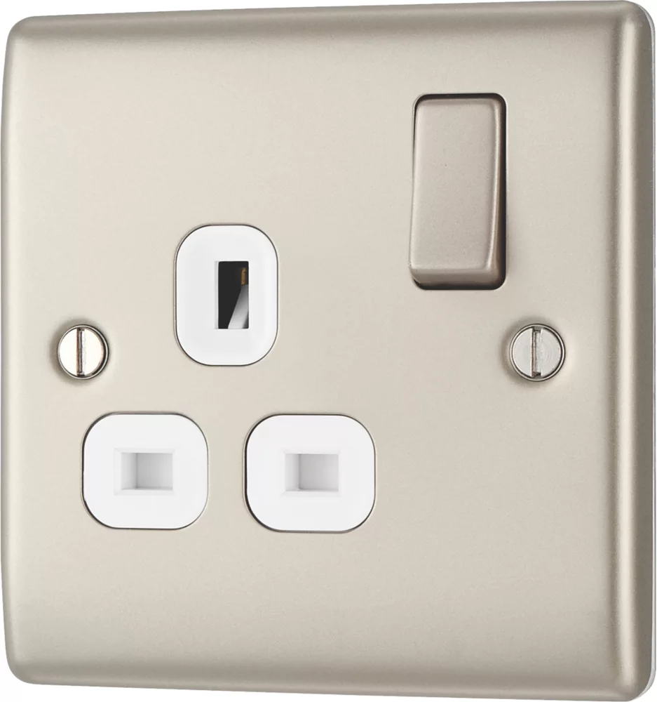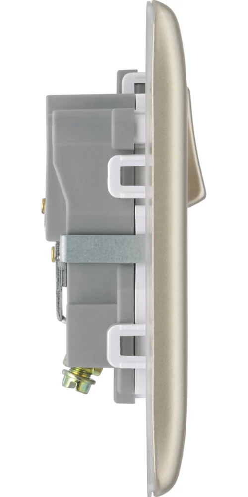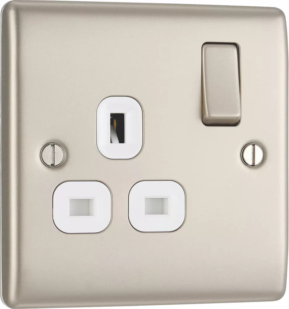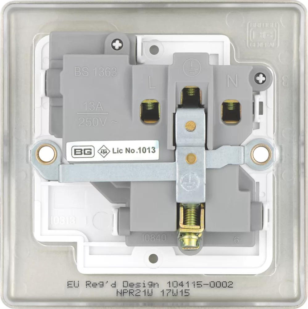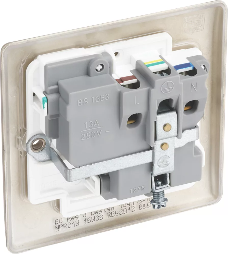 Single switched socket with colour-coded terminals and backed out captive screws for ease of installation. Fits 25mm back box, making it suitable for retro-fit replacement of existing sockets. Features slim profile with rounded edges, no visible plastic around the switches and moisture control gasket to prevent tarnishing from new plaster.