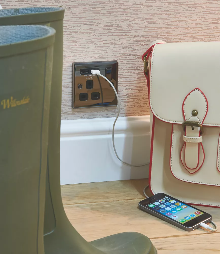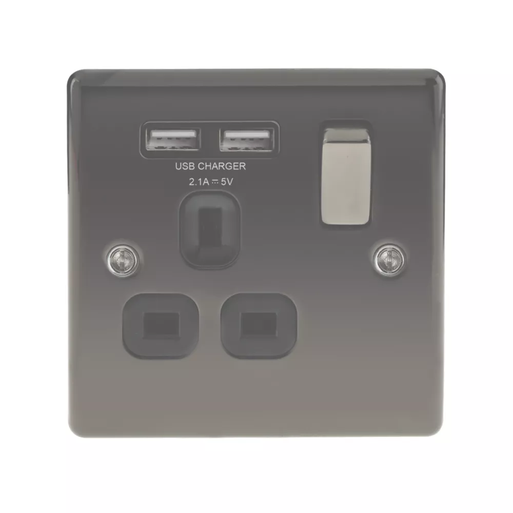 Decorative finish switched socket with 2 USB charging ports. Sleek and slim design with softly rounded corners. Features angled, in-line terminals and includes backed out captive screws for easy installation. Ideal for charging iPads, iPhones, tablets, mobiles, cameras and more.