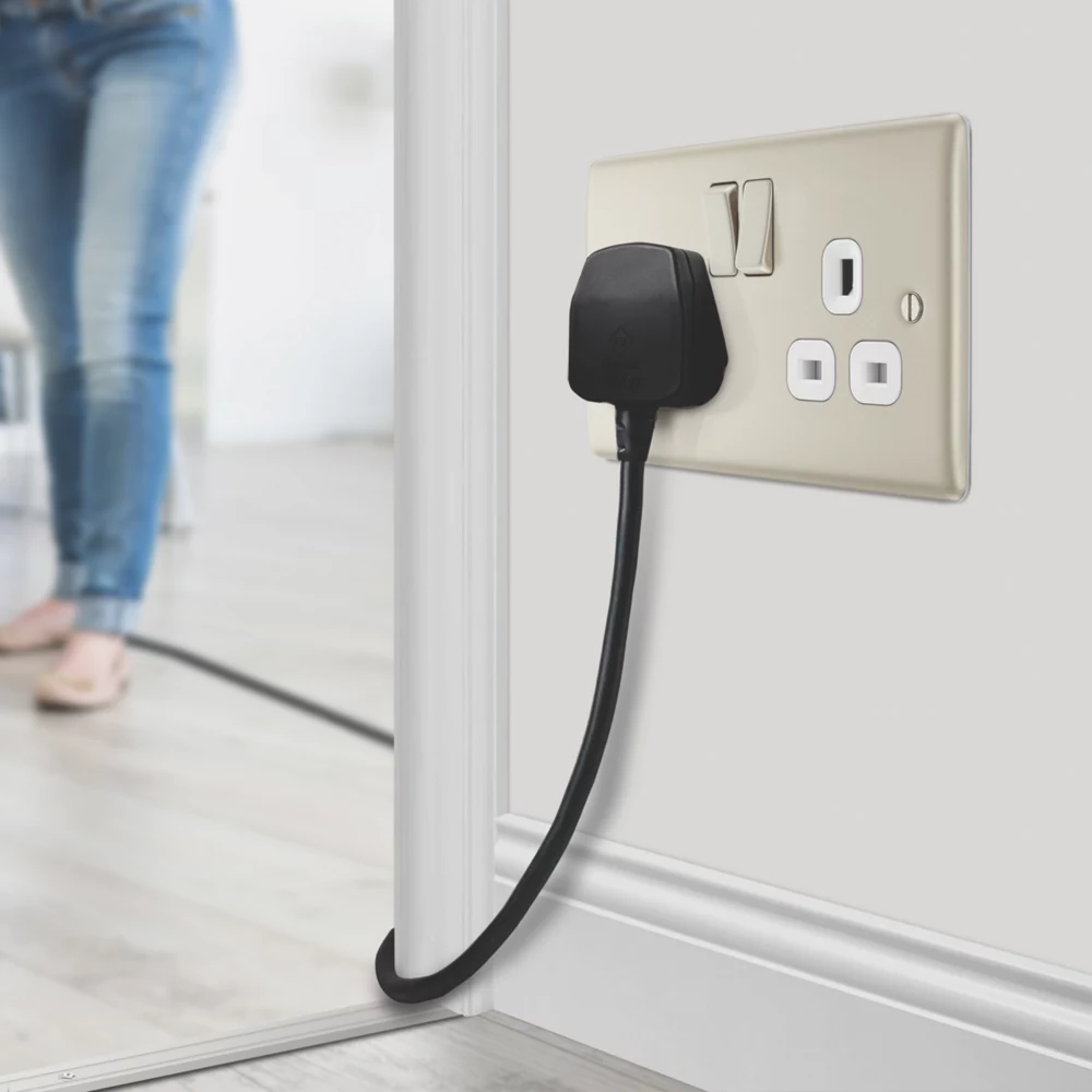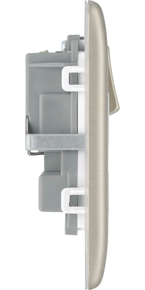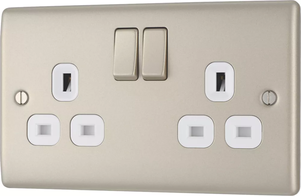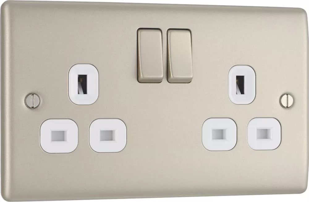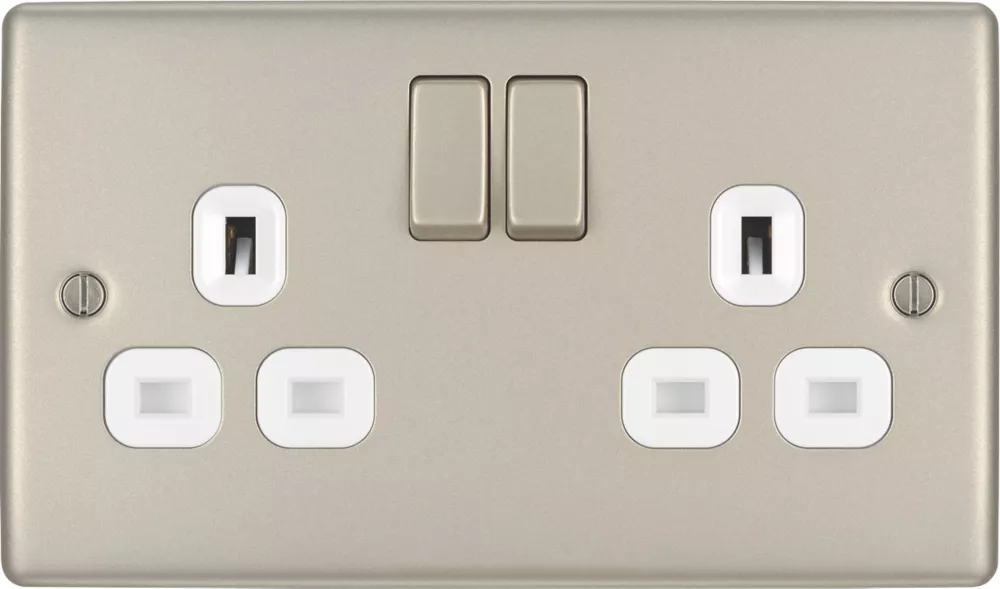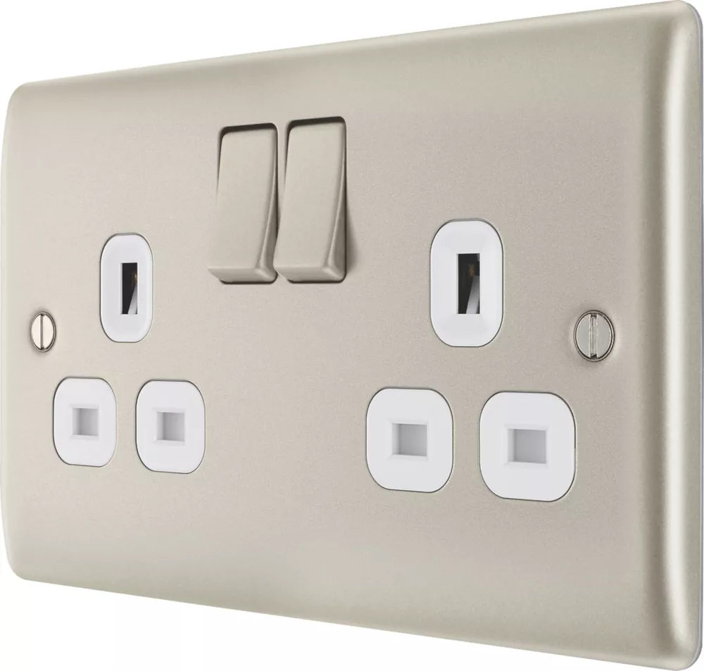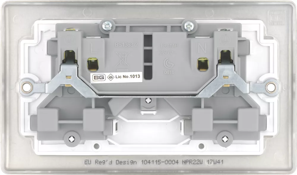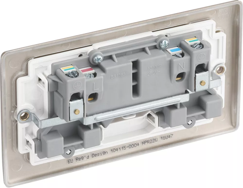 Double switched socket with colour-coded terminals and backed out captive screws for ease of installation. Fits 25mm back box, making it suitable for retro-fit replacement of existing sockets. Features slim profile with rounded edges, no visible plastic around the switches and moisture control gasket to prevent tarnishing from new plaster.