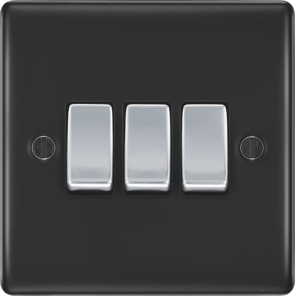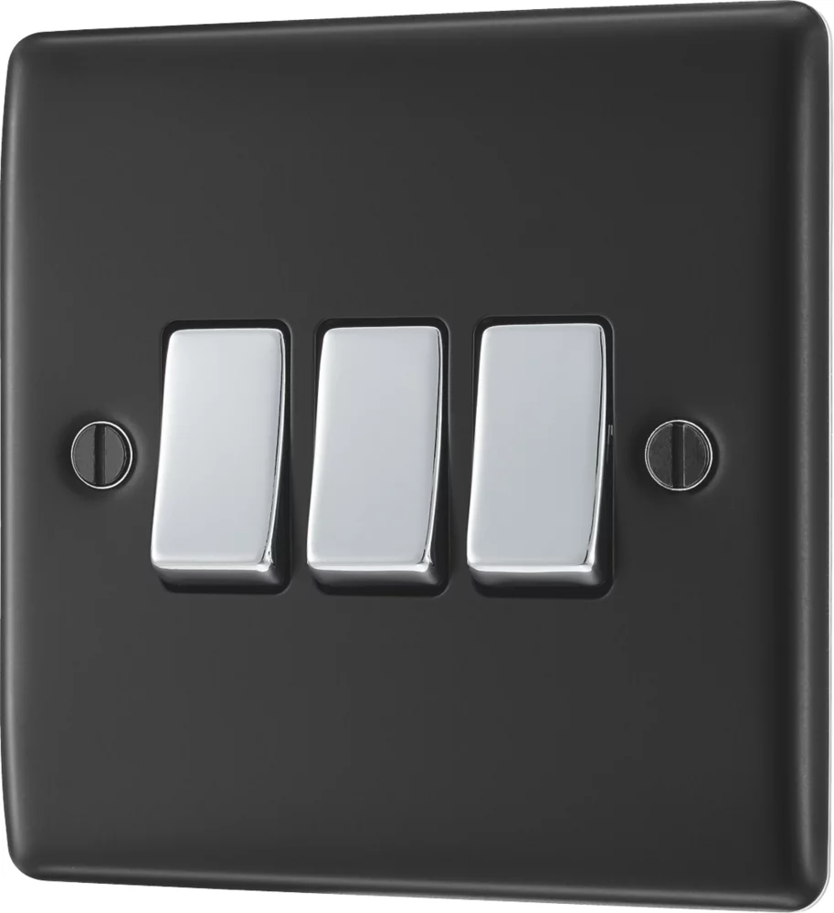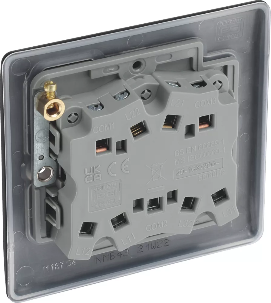 Raised, slim profile. Allows operation of 3 different lights, plus the addition to the circuit of a 2nd switch, to operate the same light from another location (e.g. at the top and bottom of the stairs). Features moisture control gasket, to prevent tarnishing from new plaster.