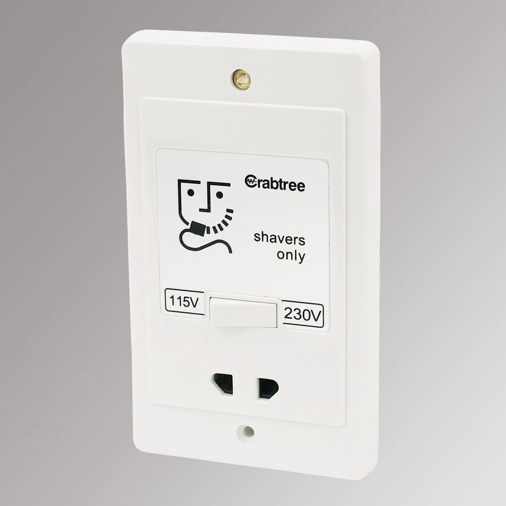 Safe, mains-only shaver socket. Only switches on when a plug is inserted. Dual voltage output with manual switching between power levels.