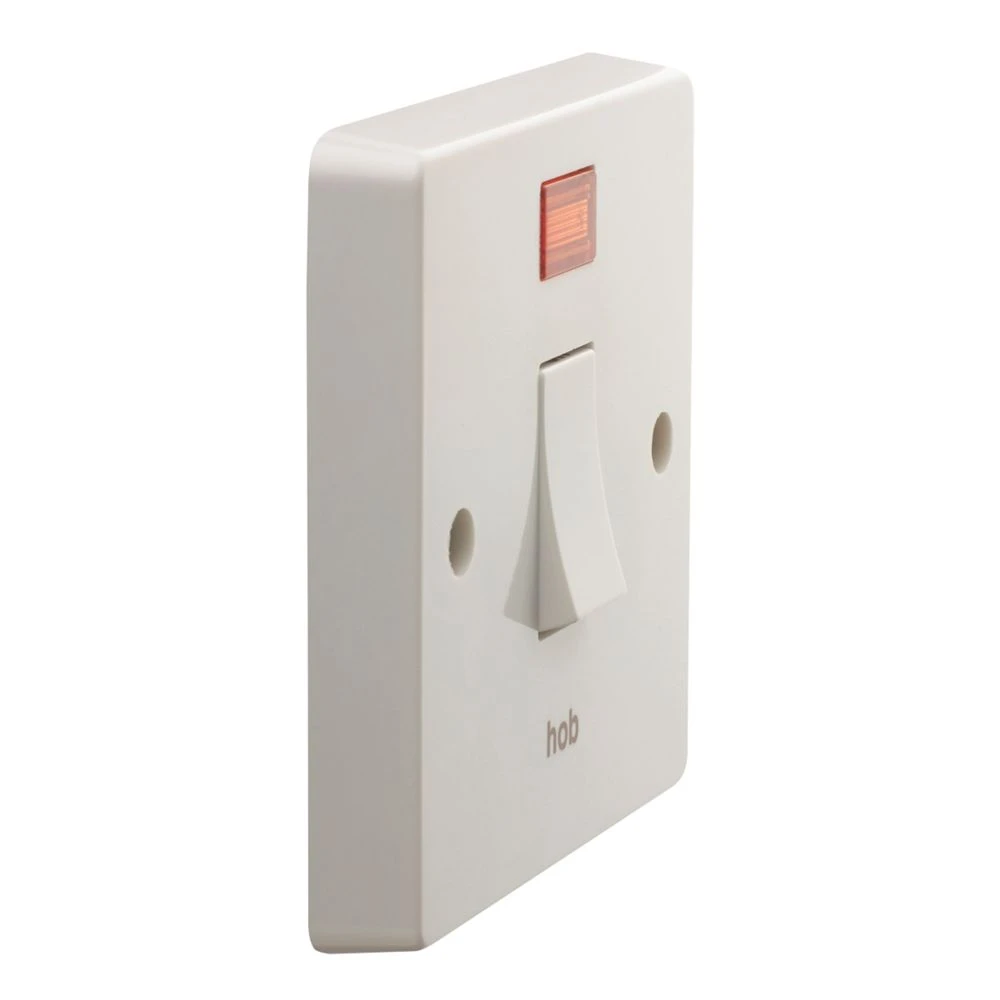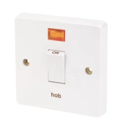 Moulded 20A double pole switch with neon indicator. Marked ‘hob’.