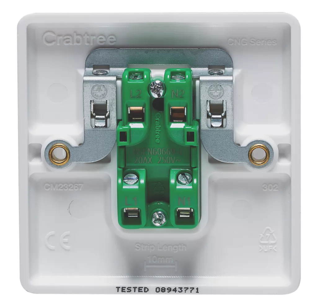 20A double-pole switch. Slim faceplate with curved top and bottom edges. Full-contact cable clamp gives improved cable retention and reduces risk of cable deformation. Inline, upward-facing terminals prevent the need for twisting/turning of plate providing safer and quicker installation. Depth consistent with other products in the Crabtree Instinct range.