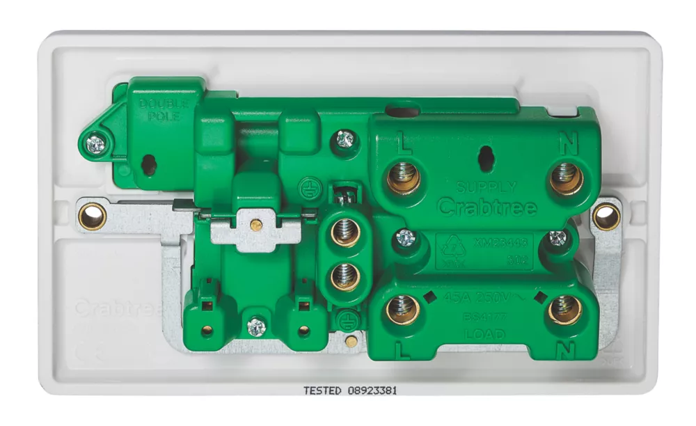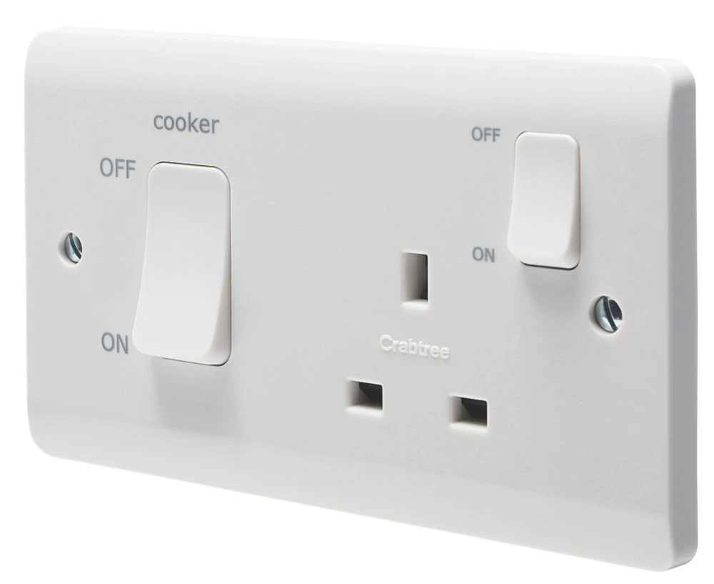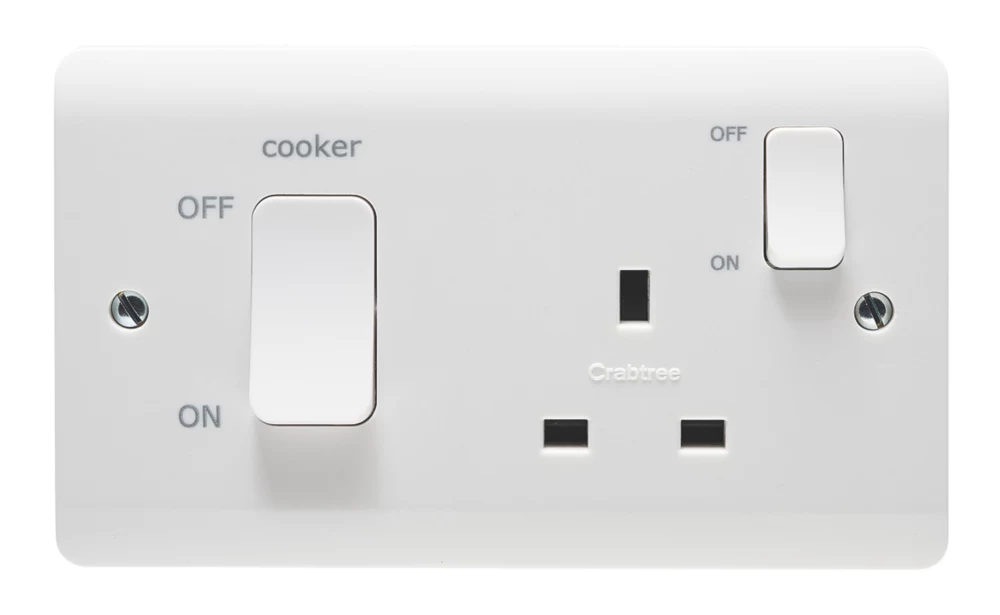 45A double pole cooker switch and 13A switched socket. Slim face plate with curved top and bottom edges. Faceplate depth consistent with other products in the Crabtree Instinct range.