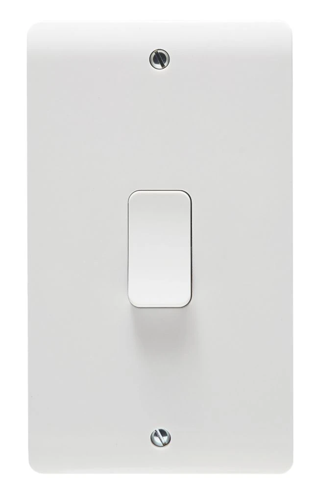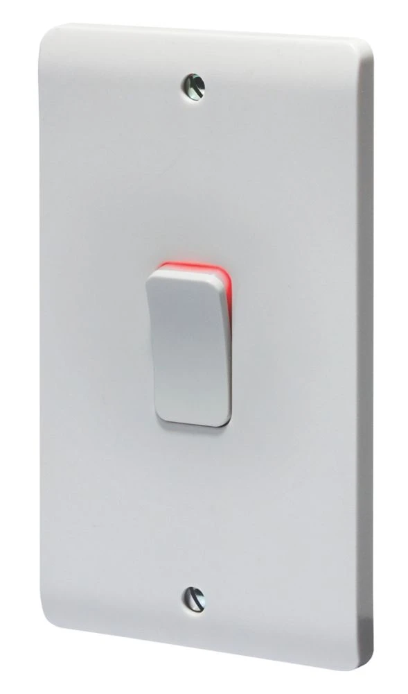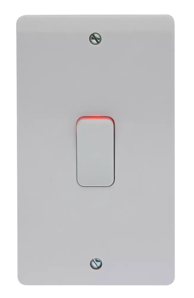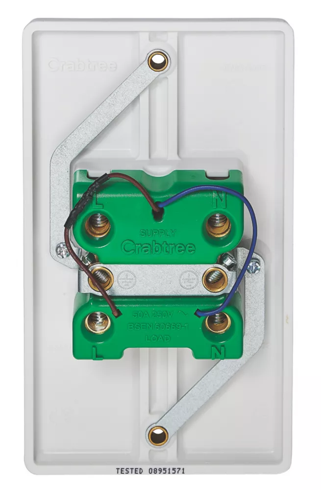 50A double-pole switch with orange LED indicator. Slim faceplate with curved top and bottom edges. Full contact cable clamp gives improved cable retention and reduces risk of cable deformation. Inline, upward-facing terminals prevent the need for twisting/turning of plate providing safer and quicker installation. Depth consistent with other products in the Crabtree Instinct range.