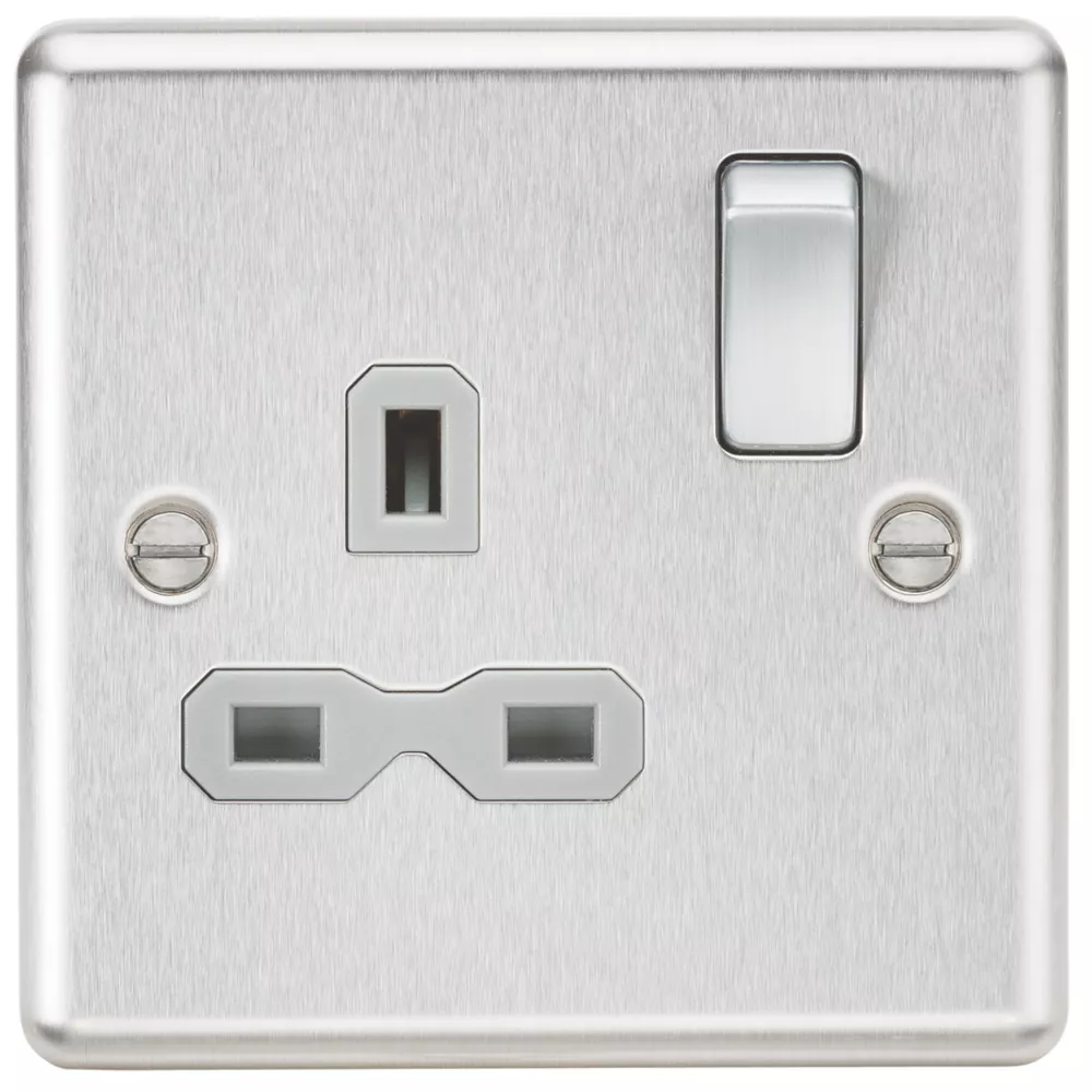 Raised, rounded-edge metal design with matching metal rocker. Socket inserts are completely hidden when plug is inserted. Built-in gasket.