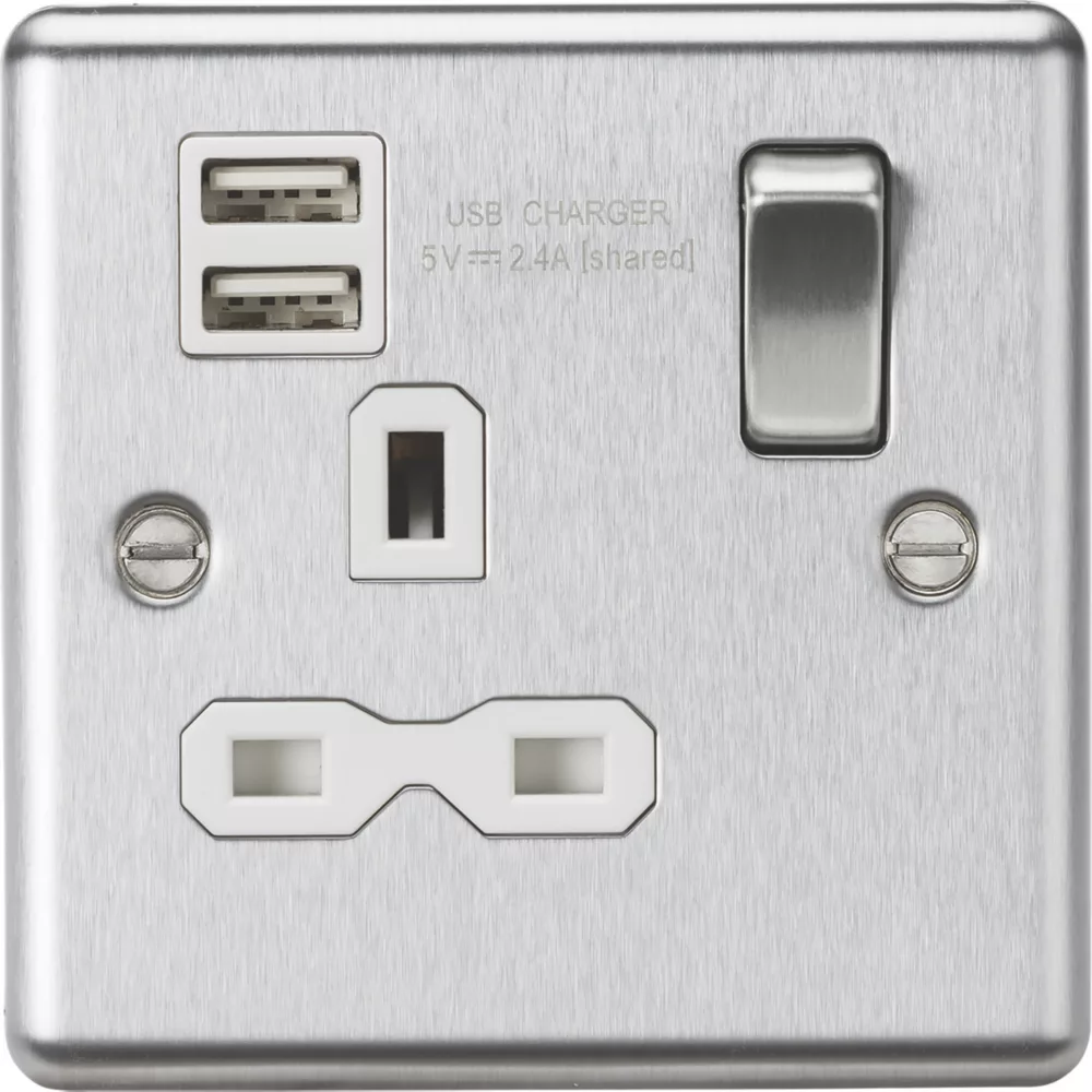 Decorative rounded-edge metal design with matching metal rocker. Built-in dual USB charger.