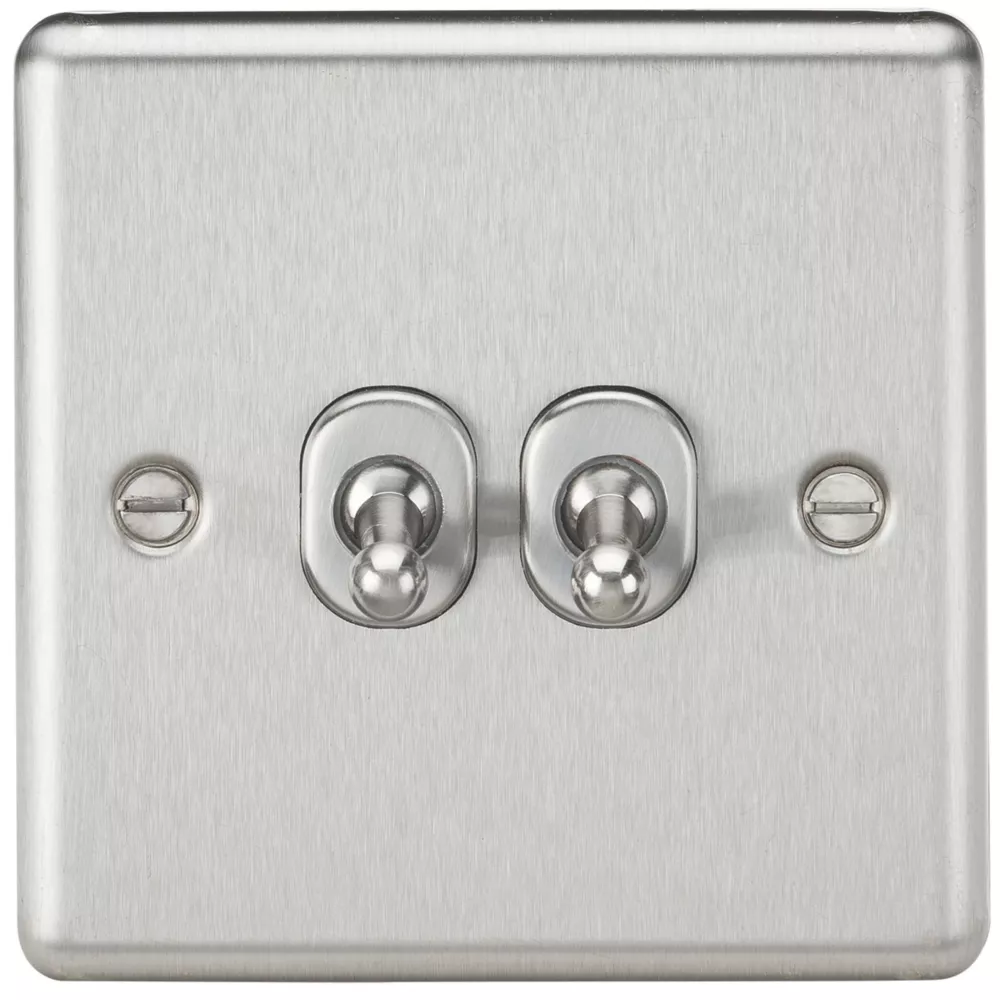 Raised, rounded-edge metal design with matching metal toggle switches.