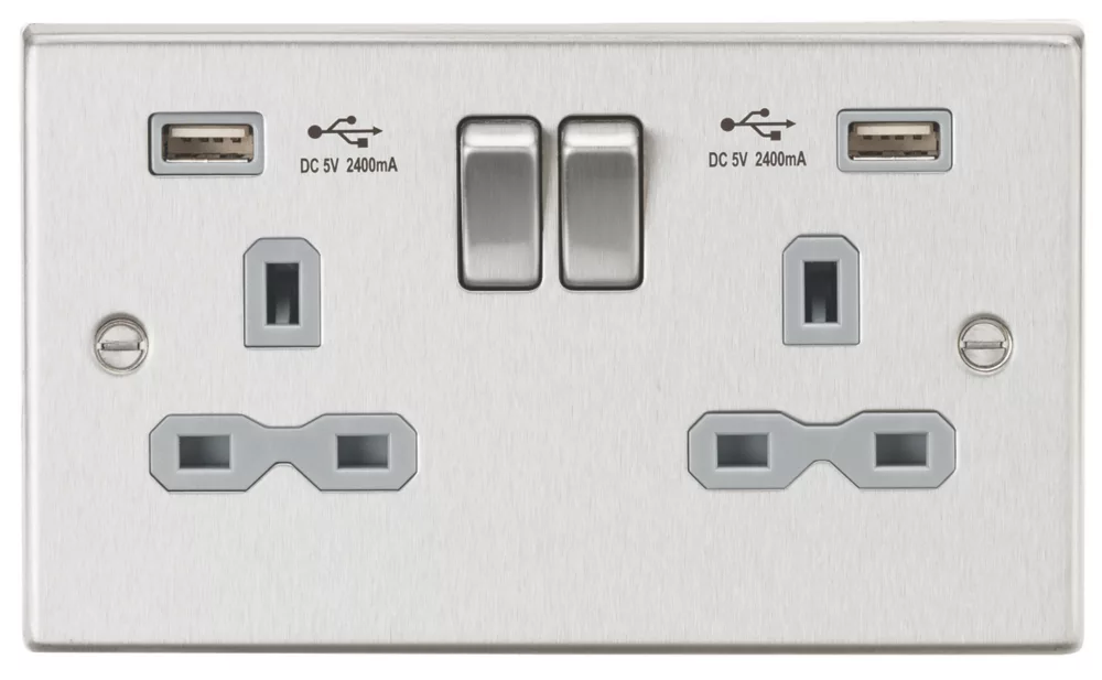 Decorative, raised square-edge design socket with matching metal rockers. Built-in dual USB charger.