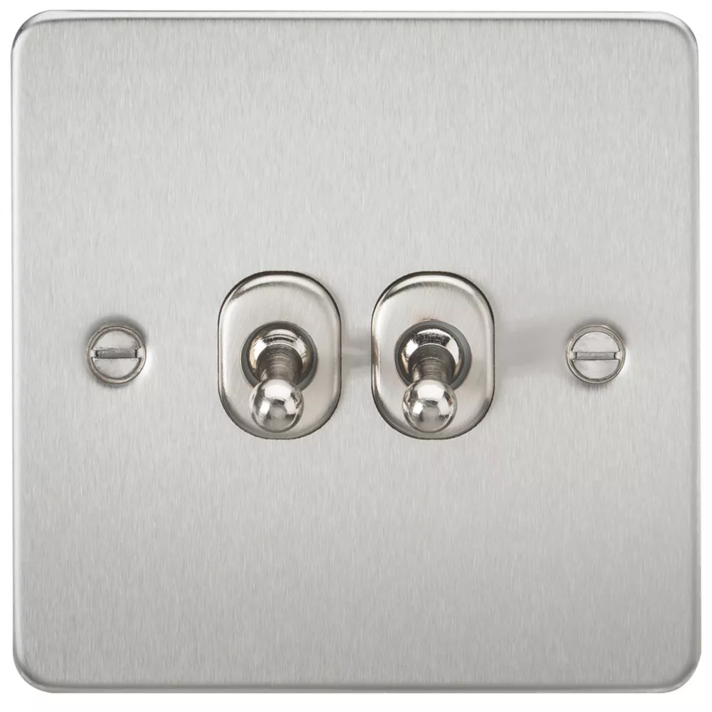 Raised, rounded-edge metal design with matching metal toggle switches.