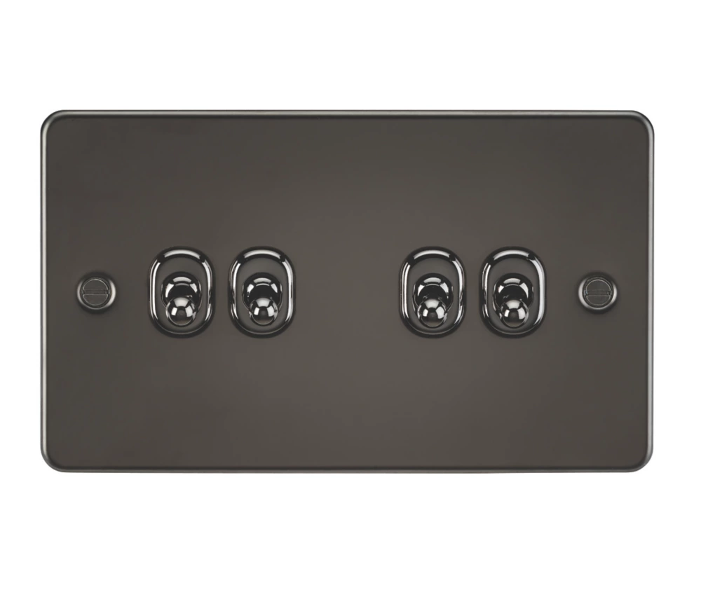 Screwless, flat plate design with matching toggle switches. Ideal for use where there are 2 switches each requiring control of the lighting in a room.