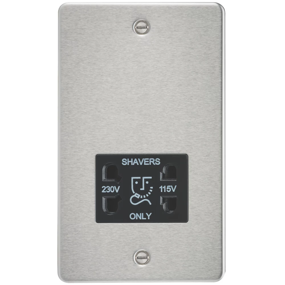 Flat plate, low profile metal design dual voltage shaver socket. Ideal for bathroom upgrades.