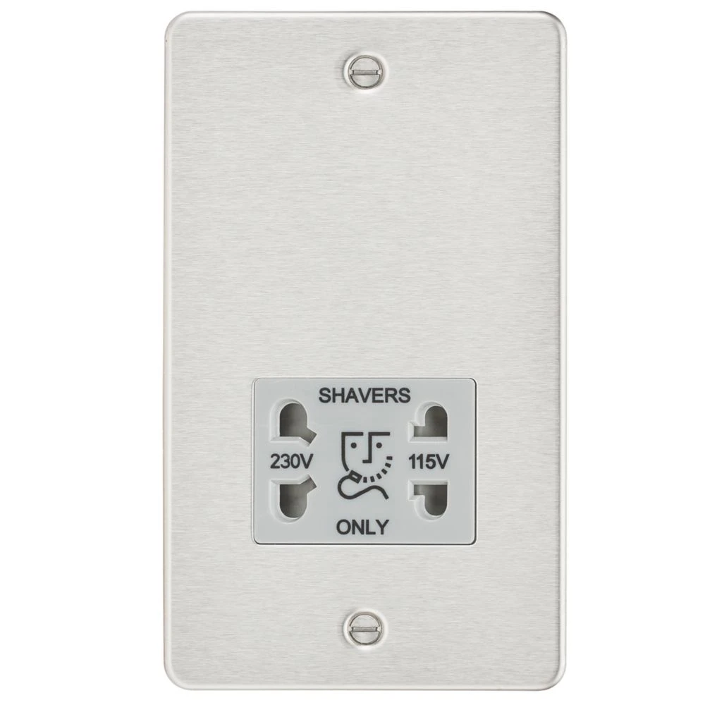 Flat plate, low profile metal design dual voltage shaver socket. Ideal for bathroom upgrades.