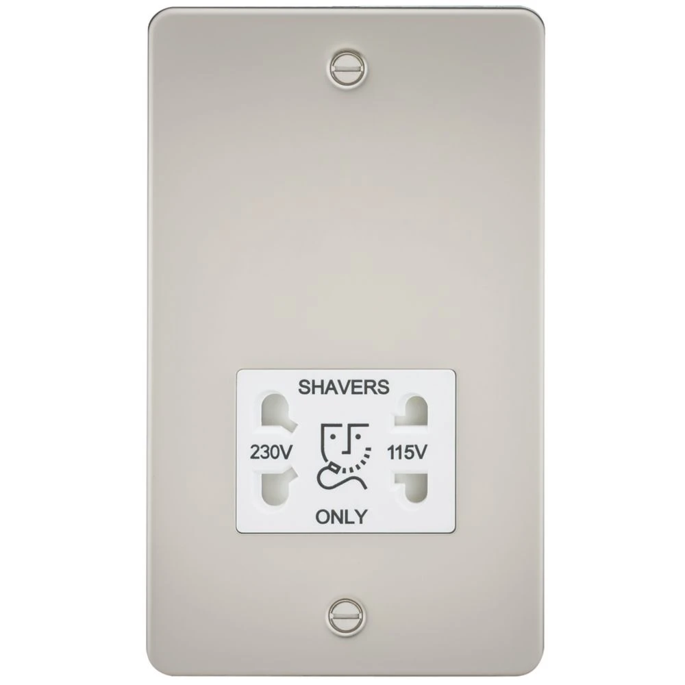 Flat plate, low profile metal design dual voltage shaver socket. Ideal for bathroom upgrades.