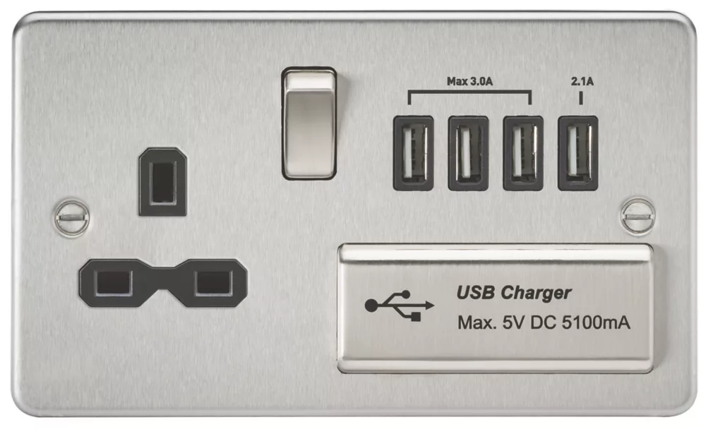 Low profile, flat plate metal-design switched socket with matching metal rockers, combined with a Quad USB charger. Ideal solution for places such as coffee shops, foyers, receptions and hotel rooms where there are multiple users.