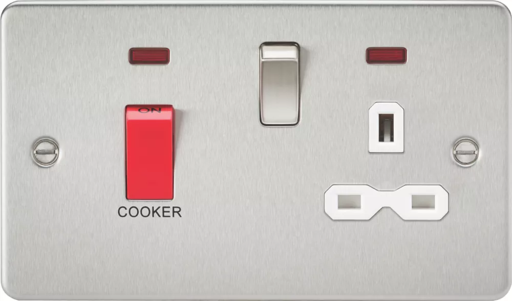 Flat profile design, 45A cooker switch combined with a 13A socket, LED indicator and built-in gasket. Allows control of 2 or more cooking appliances providing rating is sufficient, and enables isolation of the unit for maintenance and repairs.