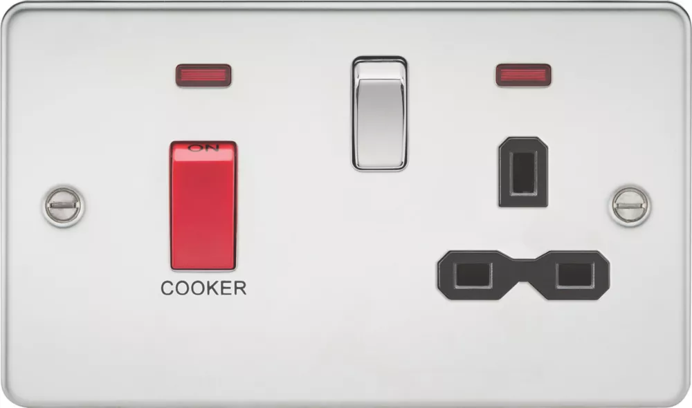 Flat profile design, 45A cooker switch combined with a 13A socket, LED indicator and built-in gasket. Allows control of 2 or more cooking appliances providing rating is sufficient, and enables isolation of the unit for maintenance and repairs.