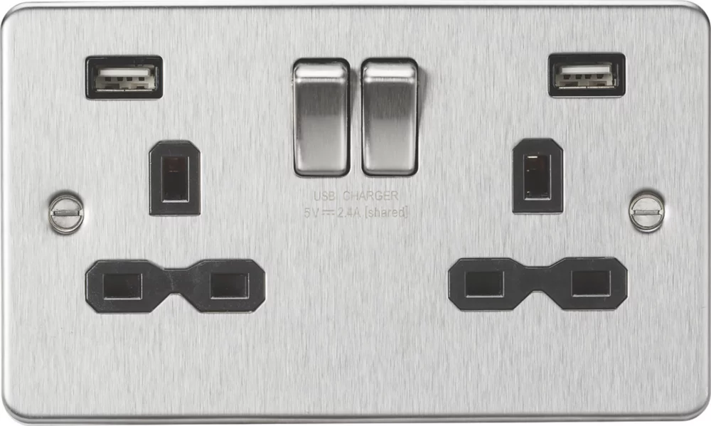 Low profile, flat plate design socket with matching metal rockers. Built-in dual USB charger.