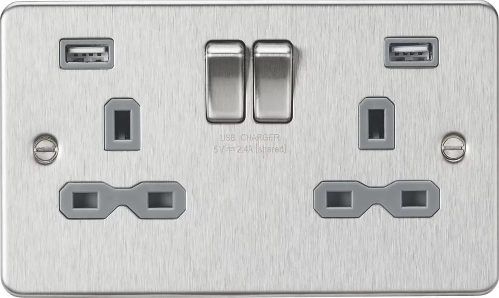 Low profile, flat plate design socket with matching metal rockers. Built-in dual USB charger.