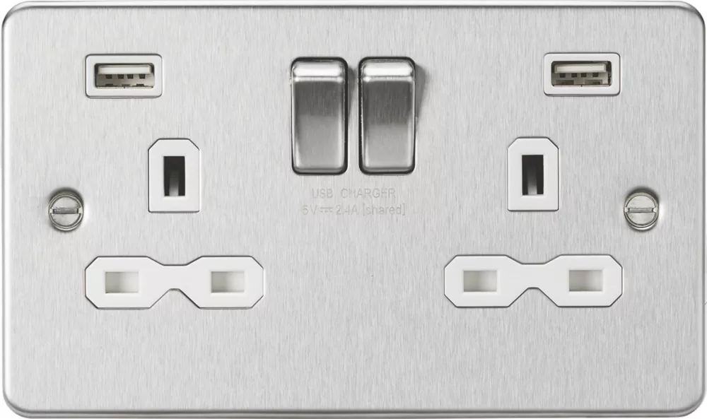 Low profile, flat plate design socket with matching metal rockers. Built-in dual USB charger.