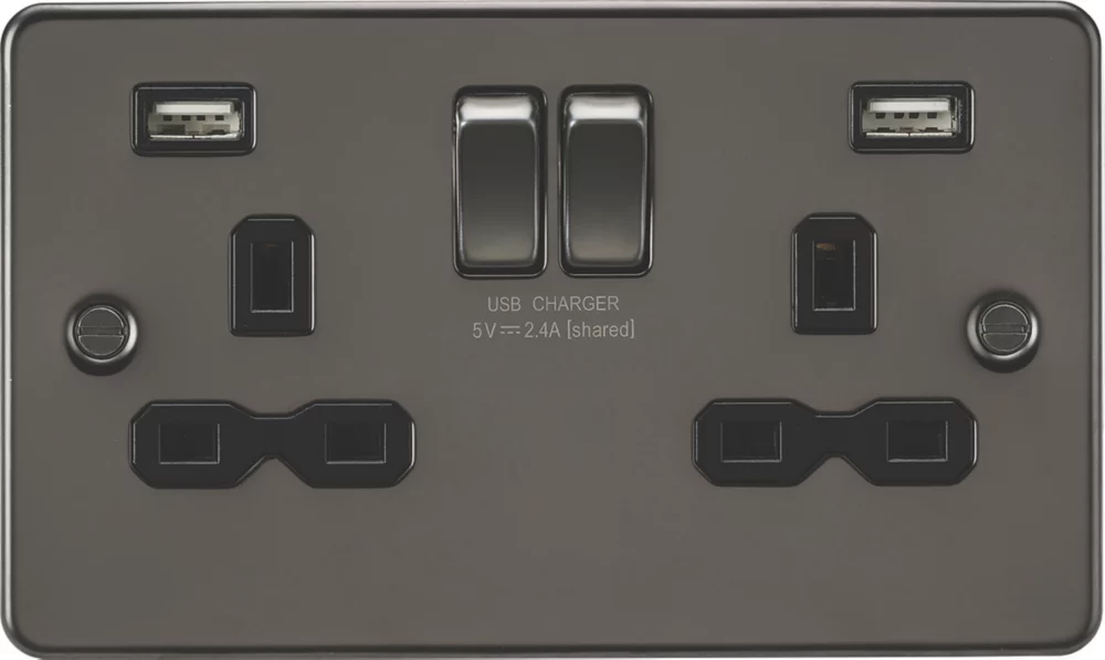 Low profile, flat plate design socket with matching metal rockers. Built-in dual USB charger.