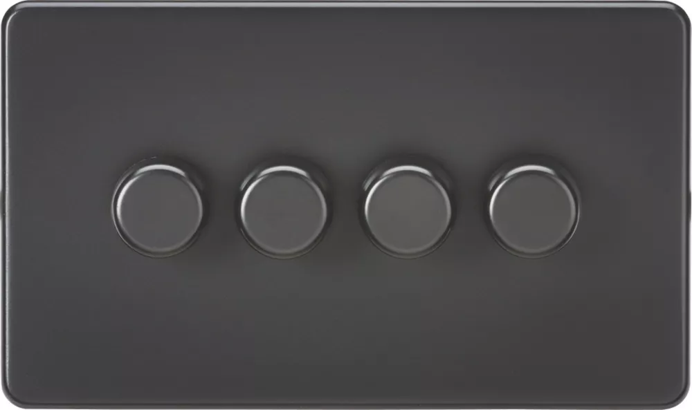 Screwless, flat plate design with matching dimmer caps. Ideal for use where there are 2 switches each requiring control of the lighting in a room.