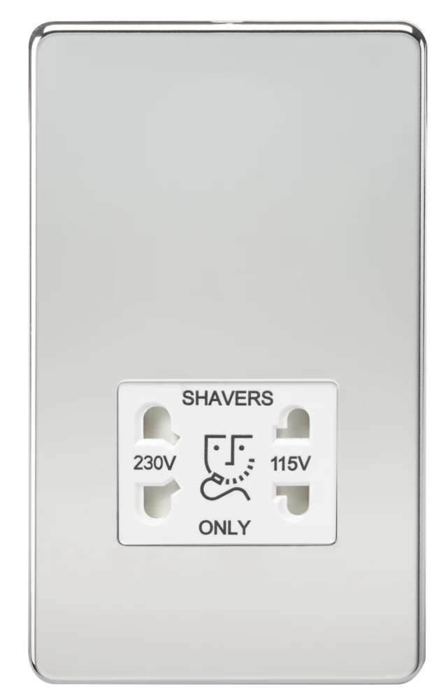 Screwless, flat plate, design dual voltage shaver socket. Ideal for bathroom upgrades.