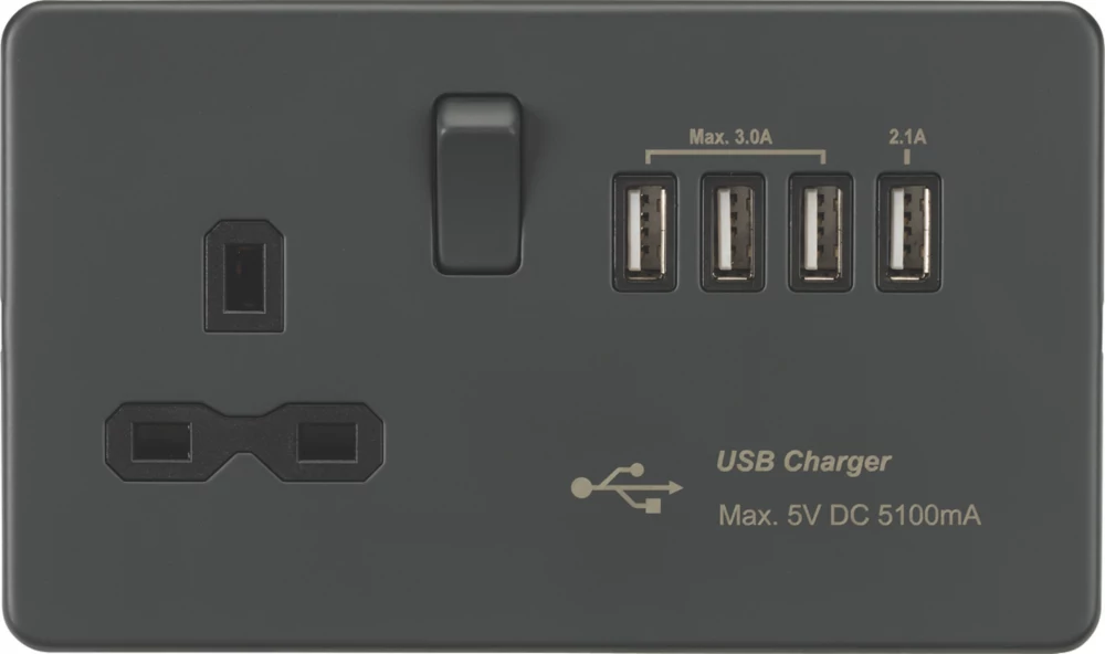 Low profile, metal-design switched socket with matching metal rockers, combined with a Quad USB charger. Ideal solution for places such as coffee shops, foyers, receptions and hotel rooms where there are multiple users.