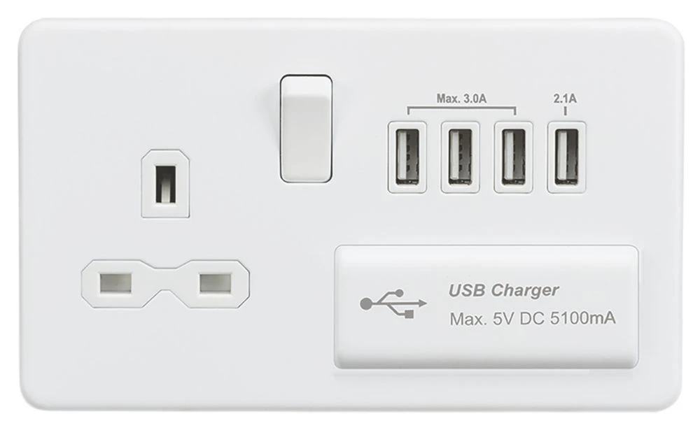 Low profile, metal-design switched socket with matching metal rockers, combined with a Quad USB charger. Ideal solution for places such as coffee shops, foyers, receptions and hotel rooms where there are multiple users.