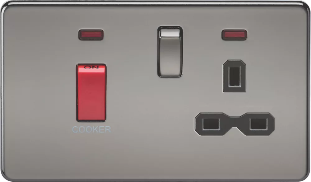 Screwless flat profile design, 45A cooker switch combined with a 13A socket, LED indicator and built-in gasket. Allows control of 2 or more cooking appliances providing rating is sufficient, and enables isolation of the unit for maintenance and repairs.