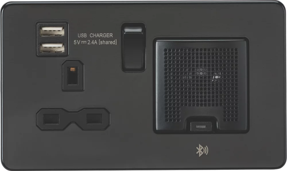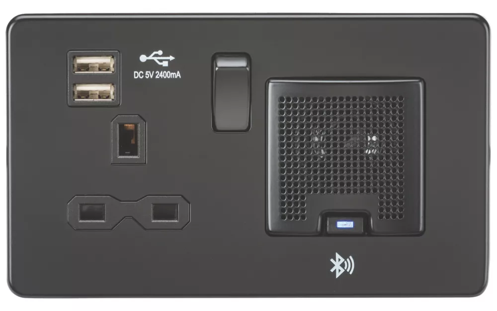 Flat profile, switched socket with USB features 3W RMS Bluetooth speaker with on/off button to connect via Bluetooth. Ideal for kitchens, bedrooms and hotel rooms.