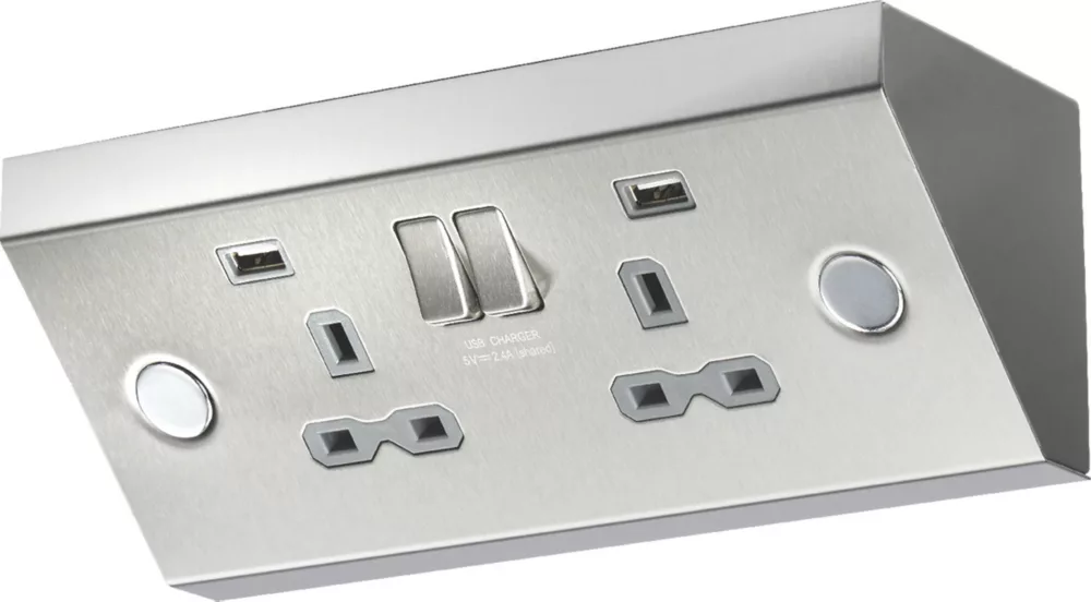 Under cabinet double socket with USB charging point for kitchens, bedrooms, utility rooms and hotel rooms.