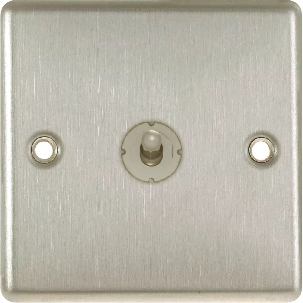 Stainless steel 1-gang toggle switch with integral moisture protection gasket.