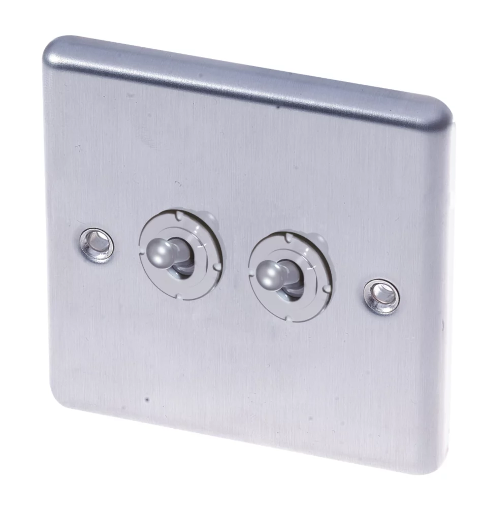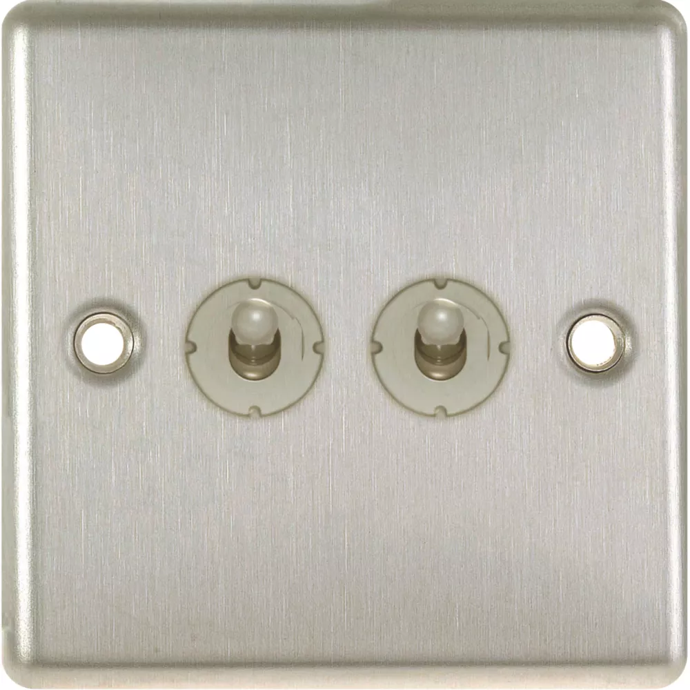 Stainless steel 2-gang toggle switch with integral moisture protection gasket.