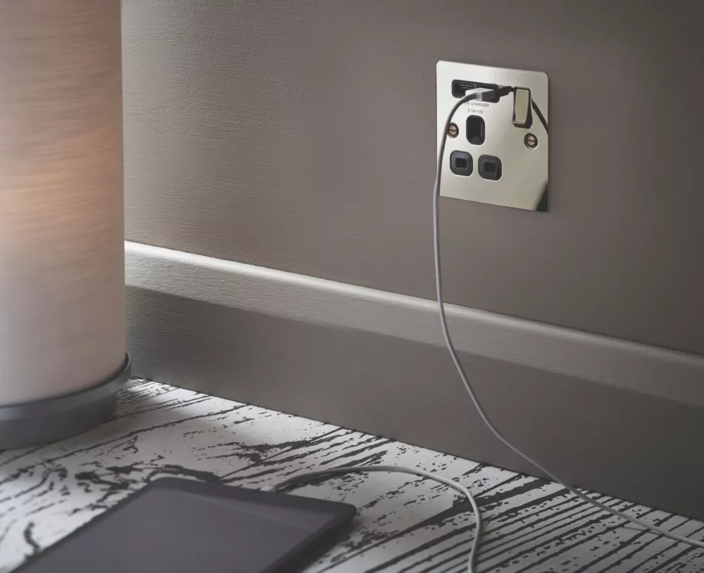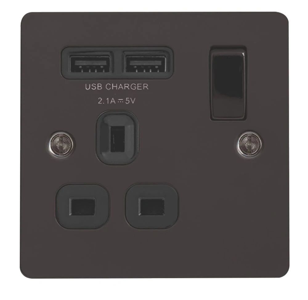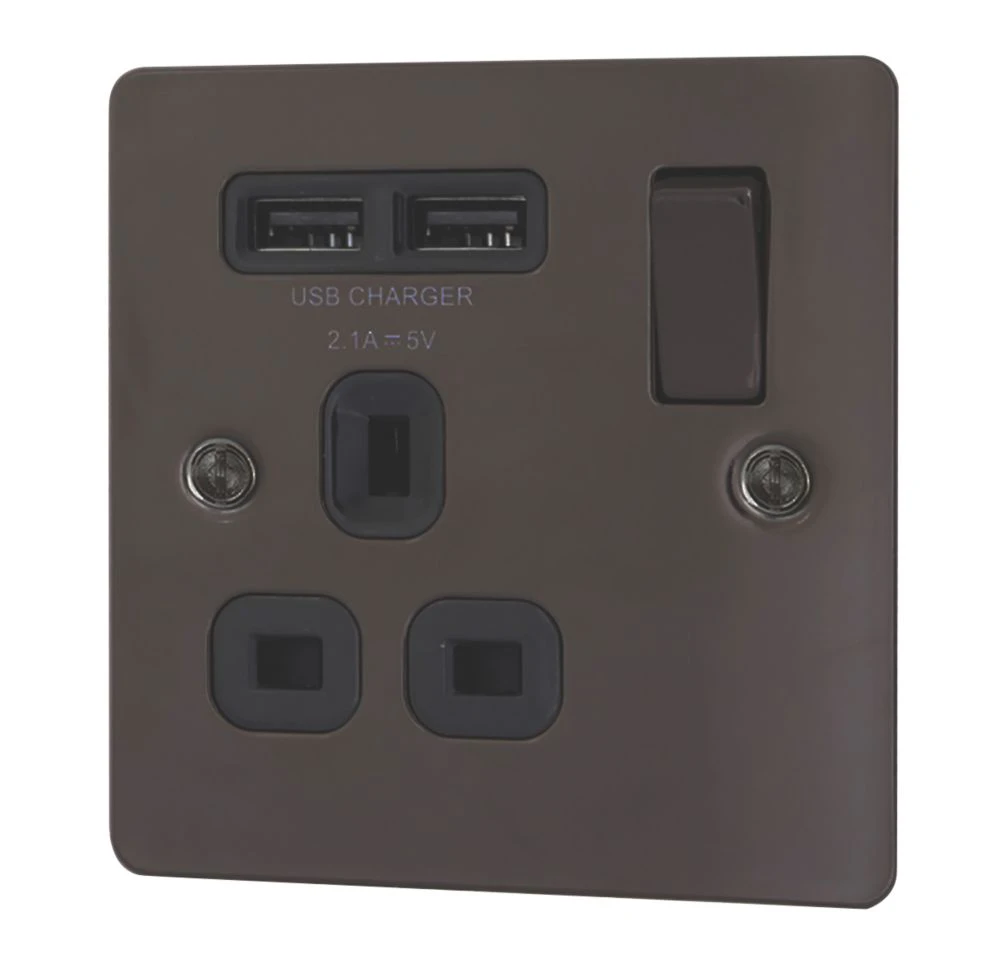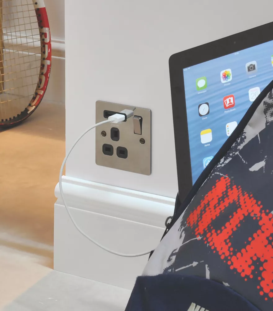 Minimal profile, decorative switched socket with 2 x USB charging ports. Features angled in-line terminals and includes backed out captive screws for easy installation. Ideal for charging iPad, iPhone, tablets, mobiles, cameras and more.