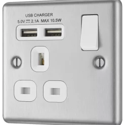 Decorative switched socket with 2 x USB charging ports. Features angled in-line terminals and includes backed out captive screws for easy installation. Ideal for charging iPads, iPhones, tablets, mobiles, cameras and more.