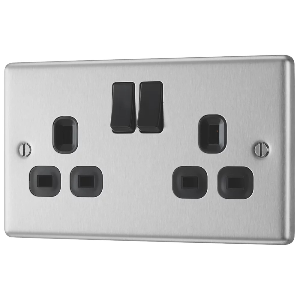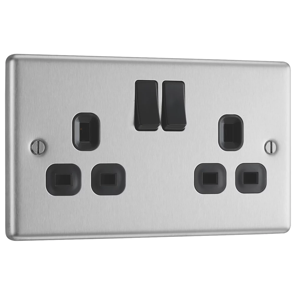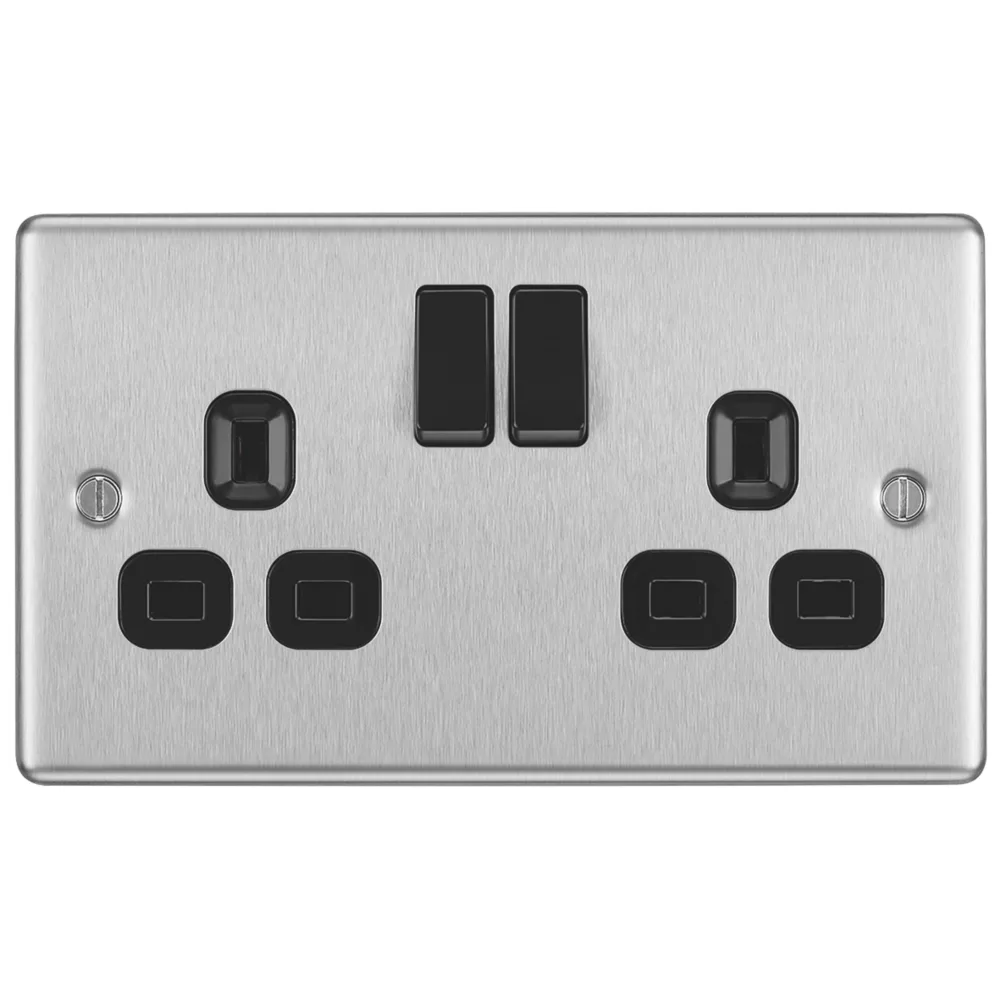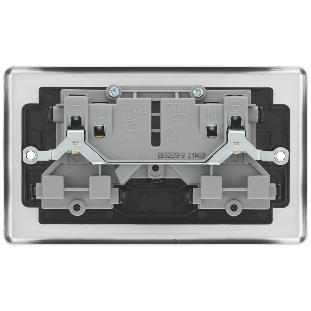 Twin earth, single pole sockets with in-line terminals and black inserts. Raised edge decorative power sockets to complement any interior decor.