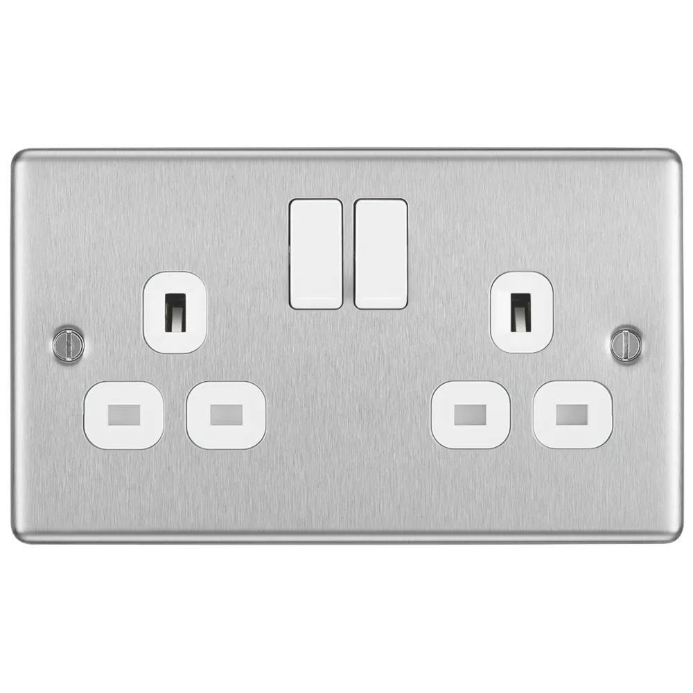 Twin earth, single pole sockets with in-line terminals and white inserts. Raised edge decorative power sockets to complement any interior decor.