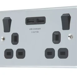 Decorative socket with 2 x USB charging ports. Ideal for charging iPads, iPhones, tablets, mobiles, cameras, MP3s and many more devices. Features angled, in-line terminals and includes backed out captive screws for easy installation.